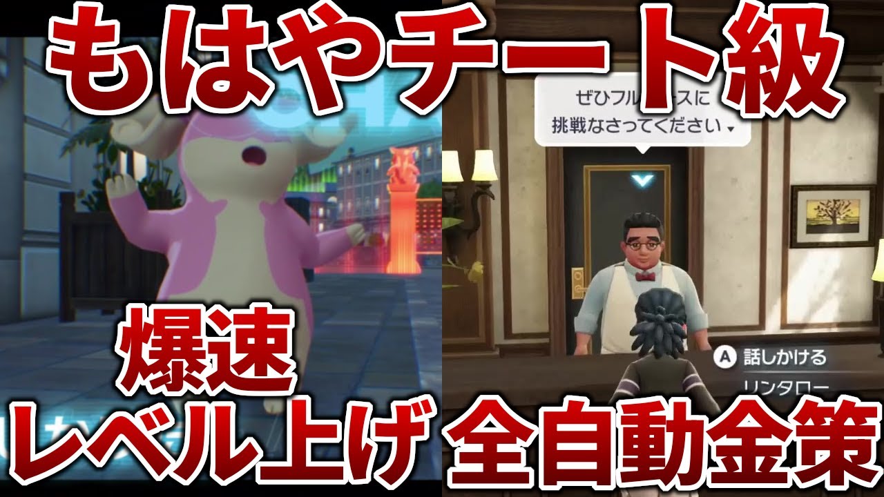皆さん、こんにちは。レジェンズZAが 発売し早くも1週間が経ちましたね。今回 の動画ではクリア後に何をするにも必須に なるレベル上げ金索を効率的に行う方法を 紹介します。まずは効率的なレベル上げに ついてです。やり方はとても簡単で Zロワイヤルのバトルゾーンで行います。 相手に気づかれないように近づき不をつい て攻撃しましょう。攻撃を指示すると同時 にローリングを駆使して相手トレーナー から遠くに離れます。うまく相手 トレーナーから離れられていると1匹目の 相手のポケモンを倒した経験値を得つつ 相手トレーナーから逃げることに成功して いるかと思います。逃げることに成功して ある程度距離が取れていると先ほどの トレーナーと1匹目のポケモンが復活して いるのでさっきと同じように気づかれない ように近づき不をついて攻撃しながら ローリングで相手トレーナーから距離を 取って逃げます。これをひたすら繰り返す ことで普通にバトルゾーンを周回して レベル上げをするよりも次の相手 トレーナーを探す時間や戦闘後のリザルト 画面をショートカットできるので効率的に レベル上げをすることが可能です。コツと してはまず少なくとも不をついた攻撃で ワンパンできることは最低限必須になって きます。また攻撃する時に使う技は ダイ文字やムーンフォースなどの技を放つ までにための長い特殊技を使いましょう。 攻撃を放つ時間が短い物理技を使うと ローリングで距離を取って逃げることが できず2匹目のポケモンを出され時間を ロスしてしまいます。そしてこのレベル 上げを行う際逃げる方向に別のトレーナー がいる時は先に倒しておきましょう。逃げ た先で別のトレーナーに見つかると効率が 悪くなるので気をつけてください。なお このレベル上げは相手トレーナーの戦闘の ポケモンが強いほど1回倒した時の もらえる経験値が上がりレベル上げの効率 が良くなります。中でも600族の海流、 ボマンダ、メダグロスなどはもらえる経験 値がかなり高いのでおすすめです。そして このレベル上げを最も効率よく行える相手 は多分になります。1匹当たりのもらえる 経験値が他のポケモンよりはかに高く、 この一撃離脱戦闘で利用できれば爆速で 自分のポケモンのレベルを上げることが 可能です。ただ1つ難点があり、多分お 手持ちの戦闘にしているポケモンセンター のお姉さんがなかなかバトルゾーンに現れ ないことです。大体1時間ぐらい Zロワイヤルをやり続けて1人出てきて くれたら嬉しいぐらいの出現率だと思い ます。そのためこのレベル上げで多分を 狙って利用するのは難しく、たまたま多分 を戦闘にしたポケモンセンターのお姉さん が出てきてくれた時にこのレベル上げを 利用するといいかと思います。タブンネが 出てこない時は海流やメダグロスなどの 600族を利用してこのレベル上げを行う か。普通にZロワイヤルを回すのがいい ですね。そしてこのレベル上げを使った ちょっとした小技があってダストダスや パンプ陣などの大爆発を使ってくる ポケモンを戦闘にしているトレーナーを 見つけたら倒しきらない程度のダメージが 入る技を使って戦闘に入ります。すると ダストダスがこちらに近づいてきて大爆発 をしようとするので先ほどまでと同じよう に距離を取って相手トレーナーから逃げ ましょう。逃げるのに成功してある程度 距離が取れているとさっきのダストダスが 復活しているのであとは先ほどまでの レベル上げ同様に同じことの繰り返しです 。このレベル上げ方法、一見ダストダスの 経験値が低いので先ほどまでより効率が 悪いように感じますがダストダスを直接 自分のポケモンで倒す必要がないため、 自分の手持ちのポケモンが全員低レベルで も行えるのがかなりいい点です。ただ1点 注意して欲しい点があって、このレベル 上げ方法は先に相手に見つかって不を 疲れると確実に相手の大爆発を食らって しまうため、戦闘に出しているポケモンの レベルが低いと一撃で倒されてしまうので 、その点は気をつけてください。また今 やっているダストダスや先ほどまでの 600族や多分を使ったレベル上げ、 どちらに関しても言えるデメリットとなり ますが、このレベル上げ方法はレベルを 上げることに関しての効率はかなりいい ですが、相手のトレーナーを全く倒してい ないので、賞金メダルがもらえない点と もみじリサーチのトレーナーとの戦闘勝利 数が全く増えない点は気をつけてください 。お金を増やしたい時や勝利数を増やし たい時は普通にZロワイヤルをやり ましょう。またレベル上げをする際は赤の かなり縫いを3つ必ず集めてからやること をお勧めします。赤のかなり縫いを3つ 持っていると通常時と比べもらえる経験値 が15%マしとなるのでレベル上げの効率 がかなり上がります。続いては全て自動で できる金索を紹介します。場所は11番 ワイルドゾーンの南頭にあるレストランド 普通。まず準備として炎の渦