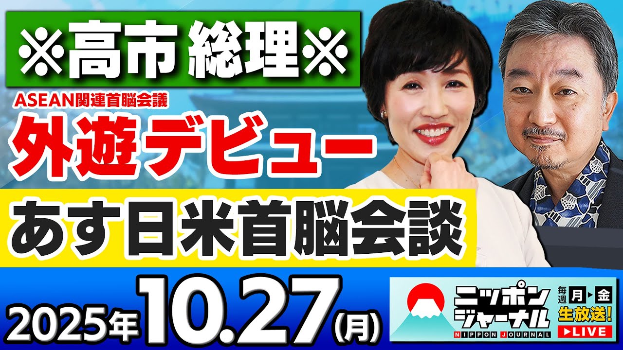 [音楽] 元気ですか?おはようございます。 10月27 日月曜日の日本ジャーナルもなく本番スタートでございますけれどもね。いや、先週なんですけれどもすいません。 ちょっとだけほんのちょっとだけ仲間打ち の話題で恐縮なんですがNHK新人落語 大賞に春風一花さんね、え、Aに輝いてお めでとうございます。もう女性の話さんと してはですね、え、2人目ということで今 もう超売れっこのね、あのカニオさんと いうね、あのおか頭の可いらしい彼女に 続いて2人目ということらしいんですけど 、何しろね、4年前に私がね、え、某あの 腐れコロナに倒れた時にですね、あれが いいですよとか、これが効きますよとかね 、もう真っ先にね、お見舞いの、え、連絡 をくれたのが彼女なんですよ。新風艇一花 さん。もうね、腕前はもう素晴らしい落岡 さんですから。何しろ今飛ぶ取り落とす 勢いの1番売れてる、え、春風艇一之助 師匠の妹弟でしということでね、もう名人 のほまれ高い春俊風艇一丁師匠の、え、 お弟さんということなんでね、いや、一花 さんはね、旦那さんも落家さんなんですよ 。人間艇馬校さん馬が好きと書いてね、馬 さんというお名前で、え、今年新内に昇し たばかりの旦那さんがご夫婦揃って話さん でね、え、ご夫婦揃って立教大学出身と いうサークル仲間だったっていうね、え、 大変ほましい落語さんのカップルでお めでたい話題続きで誠に、え、結婚という ことでね、え、春風一花さん是非、え、 落語最近好きになったよって方これから 応援してあげてください。素晴らしい話 さんなんでね、よろしくお願いします。 はい。に耐えない矢事が取り替えまくって もう偉いことになってましたけども、え、 その姿勢方針演説について、え、日本 ジャーナルレギュラーコメンテーターお 願い申し上げております明治大学政治経済 学部教授の飯田安幸さんに、え、解説 いただきました緊急動画も配信しており まして、もちろん今からでもご視聴 いただけますので、え、またさらに有料 応援プランの谷町様、ごひ様には2公部分 もご覧いただけますので、是非この機会に ですね、え、ご登録いただければと思い ます。さて、え、今週も引き続き正局に 注目ということでトランプ大統領も いよいよね、え、法日ということですから はい。え、高一政権の関連するニュースは もちろん注目の国際ニュースもずらっと 並んでおります。え、ニコニコでご視聴の 方、またYouTubeでご視聴の皆様も 是非ですね、え、ご注目のニュース番号を ですね、コメント欄にはい、ご記入 いただければと思います。チェックいき ましょう。1番高一総理初外有優で自由で 開かれたインド太平洋実現を訴えという マレーシアでね。え、そして、え、総理 フィリピン大統領と首脳会談安全保障など 連携強化へとはい。え、さらに3番、ま、 国会でのね、私方針演説飛びまくった矢事 。え、日本維新の会の吉村代表は子供に 見せられない一方で小西さんってあの、 あの人ですよね。え、あれは立派な議会 活動だとヤジがね。ああ、そうですか。 そう ですか。認識がね、全然違う。はい。うん 。なるほど。立派なお仕事ですか。はい。 そして4番目。自民維新公明がガソリン 暫定税率廃止で財源など粗案作成へとなっ ておりますね。うん。え、そして5番目。 消費減税は事実上先送りと維新藤田共同 代表合意書を巡ってというね。これも気に なるニュースですが、え、さらにこれね、 え、6番目、小泉、え、新防衛大臣平和 主義と整合すると5類撤廃へ。え、日米 防衛省も首脳会談に合わせて実の運びと いうことになりそうですか?え、なんかね 、自分があの防衛装備品のトップセールス マンになってなんていうこれはかなり斬新 なというか歴代防衛大臣で相当踏み込んだ 息にね、達した発言なんじゃないから。 これは大注目ですね。え、そして7番目、 公明党連立離脱した公明党の斎藤代表が 高一さんを独裁といった意味ではないと。 ま、姿勢方針演説に対する、え、感想と いうかコメントへのね、え、ま、批判が 相ついでいることへの釈命ということなん でしょうかね。はい。そして8番目、え、 自民の自民党の長嶋明久さんが、え、立憲 民主の、え、江田野さんの、え、安保法制 は意見なしと意見の部分がないといった 発言に苦言という10年前あなた何を おっしゃってたんですかということですよ ね。散々旗振ってね。ね、肺暗しかないっ ておっしゃってたのが急先法が江田野さん でしたよね。江田野夫さんね。10年経て ばこうなるという。はい。え、そして、え 、ロシア平和条約の締結に言及した高一 総理の演説を歓迎するということです けれども。うん。ま、これもね、え、色々 はい。うん。どういう風に受け取らなけれ ばならないのか要注意のね、発言ですよね 。え、そして、え、国際関連ニュース ずらり並んでおりますが、トランプ大統領 第1次政権に比べアセアとの連携強化に 重点移すのというとこ