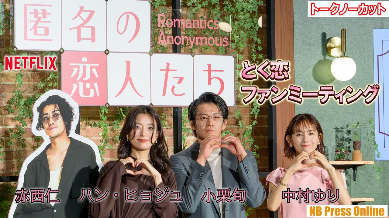 右の方にではスチールさんサイトおしゃルで押さえさせていただいてはい。 [音楽] [拍手] [拍手] [音楽] [拍手] [音楽] 続いて人の目が怖い天才ショコラティエ 花 さんです。そして潔癖すぎる成果メーカー 温存士藤原小さんです。 [拍手] それではステージの方にお越しください。 [拍手] 改めて皆さんよろしくお願いします。 よろしくお願いします。 お願いします。 ちょっともう早速泣いてる方もね、いらっしゃるぐらい完成も上がっておりましたけれども、まずは小俊さんから皆さんにご挨拶をお願いします。 あ、どうも皆さんおぐりです。本日はありがとうございます。 え、大勢の方が、え、この作品を楽しんでくれているようなので非常に嬉しいですし、ほっとしています。あの、ちょっと今日目が炎症起こしちゃって、あの、真っ赤になっちゃってるんですけど、それでメ鏡ネを書けさせてもらってますが、え、楽しんでいっていただけたらと思います。どうぞよろしくお願いします。 よろしくお願いします。続いてひさんお願いします。よえ、こんにちは。 [拍手] [拍手] こうやっていき本当に嬉しいです。なんか感動します。もう始まる前にこんなに感動して涙が出そうな嬉しさです。本当に相えて嬉しいです。ありがとうございます。 [拍手] ありがとうございます。そして中村ゆさんお願いします。 え、皆さんこんにちは。 今日はちょっと赤西君がいらっしゃらない ので私がこのおい2人のお邪魔してる みたいになってるんですけど今日は皆さん とちょっと女子会するような気持ちでき ましたので楽しんでいきましょう。 よろしくお願いします。お願いいたします 。では皆さんおかけいただいて早速進めて いきたいと思います。マスコミの方々ここ からのフラッシュ撮影は一度お休み いただくようお願い申し上げます。さあ、 え、10月16日Netflixで世界 独占配信が開始されたばかりの匿名の恋人 たちなんですが、皆さんね、もちろんあの オンラインで5話まで、え、この会場の 方々は死者でご覧いただいているかなと 思うんですけれども、前見たよっていう方 どれぐらいいらっしゃいますか?あ、もう ほぼじゃないですか。はい。そして作品 面白かったという方はもう是非ね、いい ですよね。あの、私も前は拝見しましたが 、もちろんラブストーリーとして、あの、 とっても見応えがある作品というだけでは なくて、あの、大人でもね、1人では なかなか克服できない不器用さであるとか 、自分のもうその像症状みたいなこともお 互い助け合って認め合って一緒に生きてい くってところが描かれていて本当に感動し ましたね。今日はあの作品見返したくなる ようなトークを是非撮影の歌裏なんかも皆 さんに聞かせていただきたいなと思うん ですが早速最初のコーナーに参りたいと 思います。大して匿名の恋人たち略して 特行アフタートーク。 はい。あの今モニターに出ております。 こちら2人の関係性を紡ぐ7つの チョコレートレインボーパレットが 映し出されております。皆さんも作品ご覧 になってきっと食べたいと思ったはずなん ですが、あのチョコレートにはですね、 選んでいただくと、え、事前に募集した 質問が書かれております。これ作品に 関することも含まれているんですが、今日 はネタバレありでもう皆さん見てる前提で 答えていただきたいなと思います。 そして実はですね、今日本作の監督を務められました月川小監督も会場にお越しいただいております。お立ちいただいてよろしいでしょうか? こんにちは。監督の月川と申します。 よろしくお願いします。 えっと、もうあのこの1 週間ずっとこう英語さしながら皆さんの感想を拝見していて、あのすごくポジティブなあのコメントが多くて安心しております。今日報して皆さんにお会いできてとても嬉しいです。 で、あの、せっかくならね、やっぱこう メインキャスト4人揃っていたらなと思っ て、で、ちょっと赤西人さん来れなかった んで、昨日夜メールして、あの、何かあの 、お伝えしたいコメントあれば、あの、 代理でお伝えしますよといったところ、 ちょっとメッセージいただいたので大独し ますね。えっと、本日お越しいただいた 関係者の皆様、メディアの皆様、そして足 を運んでくださった皆様、この度高田博役 を演じさせていただいた赤西人です。本日 は極度の潔癖症視線恐怖症がオグリン限定 で発症してしまったため欠席させて いただく運びとなりました。え、冗談は さておき、え、今回は久しぶりの日本での 作品でNetflixさんには大変お世話 になりました。俳優人ものびノび楽しく 撮影させていただきました。日本韓国の 優秀なスタッフとご一緒させていただき、 とても貴重な経験をさせていただきました 。役を演じる上で韓国のプロデューサー 監督とたくさんの打ち合わせを重ね高田ひ としてお芝居いをしないお芝居を心がけて やらせていただきました。まだご覧になら れていない方は是非ご味く