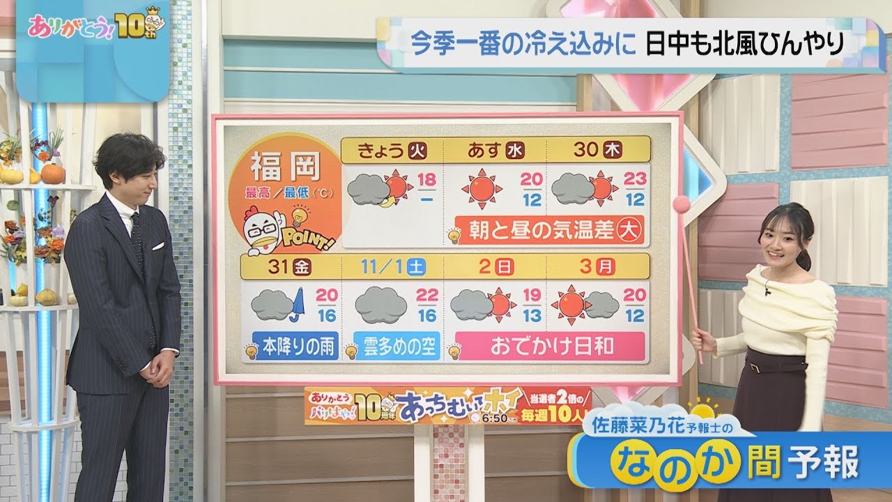 はい、今の福岡市の空です。雲が少し多いんですけれども、隙間からは朝日が見えています。 今の福岡市の気温は14.8°。 うん。 今日は各地で今シーズン最も低い気温を更新しています。 本当 らさん、今朝は出勤の際ニットを来てらっしゃいましたね。 ニ来ました。本当 なんか急に一気に寒くなりましたね。 寒くて本当に。 うん。 各手の今日の最低、あ、現在の気温見てみますと。 はい。え、町では、黒木では 9.7、もう10°下回っているところもあるんです。 そして後地方には今シーズン初の下注意法が発表されています。 農作物の管理にも注意が必要です。 そして今日は日中もあまり気温が上がらないんですよ。 最高気温はどうなのか見てみますと。 おお、 昨日よりも 4°くらい低いところが多い予想です。 はい、 後のほとんでは届かないとがいい込みです。 昨日から今日にかけての時間ごとの気温の移り変わり見てみると はい。 え、まず昨日の朝の最低気温福岡市では17°から18°くらいでした。 はい。 え、それが今日の最高気温が18°の予想ですので、もう昨日の最低と今日の最高が同じくらいの予想なんですよね。うん。 さらに夕方以降ぐんぐん気温が下がりまして、今夜は今朝よりももっと気温が下がる見込みですので、ちょっとお出かけの際は服装選びにご注意ください。 では今日の電気です。福岡、北九州地方。午前を中心に雲が広がります。午後になると日しが届くでしょう。雨が降ることはなく、雨は持たなくても大丈夫そうです。 はい。 地後方地方佐賀県。 こちらも午前中は少し雲が多い時間があるんですが、午後はよく晴れるでしょう。洗濯物もしっかりと乾きそうです。 1週間丸り7 日間違予報。明日明後日はですね、日中の寒さは少し柔らぬぐんですが、朝の寒さは強まりますので。 はい。そうですね。ぐっとね。 はい。朝と昼の気温さが大きくなりそうです。 そして金曜日各地で本りの雨でしょう。 今週末3 連休という方もいらっしゃるかと思うんですが。 はい。お 出かけは日曜日と月曜日がおすめです。