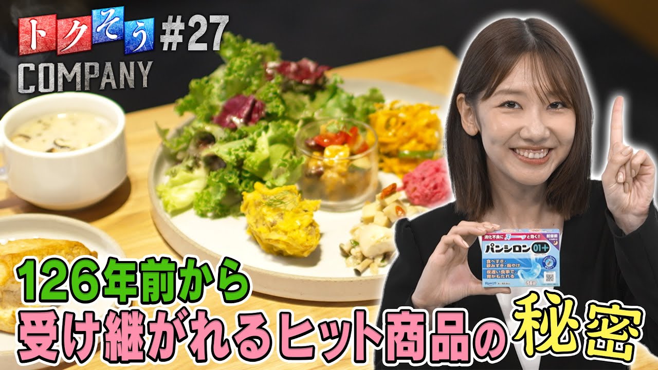 日々進化し続ける企業のお得な情報を操作する会社。それが特カンパニー。 [音楽] 126 年前から受け継がれるロート製約のヒット商品に隠された秘密を特 ロート制薬の小崎です。こんにちは。 こんにちは。 知られざるロート製薬丸クイズ第 会社に運動会もできるグラウンドがある。 会社のグラウンドはもう見たことないから待つ。 ここで大運動会も開かれているんですよ。 ええ、芝グランドすごい。 第2問製約会社なのにレストラン。 制約会社にはないんじゃないですか? 正解は丸です。ええ、 お腹の底から元気になれるコンセプトとしてロートレシピというレストランをオープンしました。 ええ、すごい。薬に頼りすぎない制約会社。うわあ、素敵。 [音楽] おすすめは季節のデリセットです。 美味しそう。 最初に薬前スープ飲むことでしょか?助ける。 おお、 コがあって美味しい。 いい顔。 では第3 問。ロート製薬が最初に発売した商品は目薬である。 えー、でもイメージあるけど。あ、この答えが特ポイントだ。えー、でも丸 正解はこちら。一腸薬です。 明治32 年に発売された一腸薬がこちらです。 [音楽] 明治時代は肉食が広がるなど食の洋化が大きく進み胃井も増えました。満病の元は胃にあると考え発売されました。 [音楽] 役薬の始まりは一応役なんですね。 [音楽] 今はこちらに。 うわ、こんなにあるの?パンシロンは世代を問わずあらゆる人の胃の健康を支えるべく様々な商品を展開しています。 いや、私もついつい爆色しちゃって夜ちょっといたれするのが悩みなんですよね。 柏上さんにはこちらがおすすめです。 はい。 パンシロン01です。 寝る前の服用もできて夜遅い食の日にも使っていただけます。パンシロン最多の [音楽] 13 種類の有効成分が消化を助けよ元気に整えてくれるんですよ。 すごい メントルの爽やかさでスーっとしたすっきり感もあり飲みやすいです。 うん。今夜は焼肉に決定。