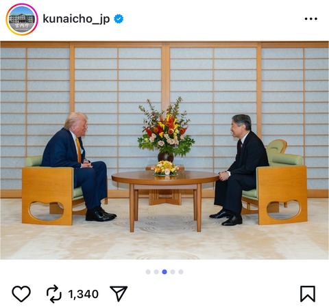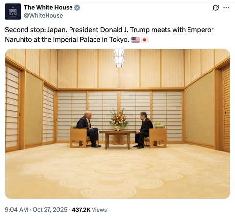 1:以下、?ちゃんねるからVIPがお送りします:2025/10/29(水) 23:24:42.042 ID:LtUzZpI40NIKU 宮内庁が撮ったトランプ大統領と天皇の謁見写真 ホワイトハウスが撮った同じシーンの写真 日本の写真の撮り方が下手すぎて世界に笑われていると世界で話題に2:以下、?ちゃんねるからVIPがお送りします:2025/10/29(水) 23:25:53.224 ID:hPrSX9vz0NIKU 何このポツンと一軒家みたいな構図 2ch2chblognews2ch