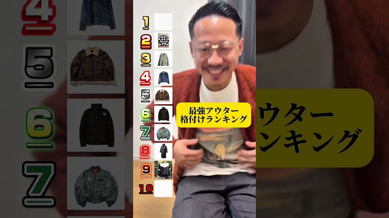 ウプシ。 ウプシ。ま、いいと思いますよね。汎用性高いんで。ま、 6。 おお。B3。 B3ね。5。お。水ノピステ。 水ノのピステ。うん。通称シャカシャカですね。 9。お世になったんでね。9。 マクレガーのモヘアカーディ。 うわ。3で。 おお。3位高い。 やっぱりスペシャルなんで。 はい。 MA1。 MA1。うーん。7 位。7。 リーバイスのデニムジャケット。 うわあ。4。4。うん。 え、水ノのベンチコート。 ベンチコートちゃんとあったやね。 8としときましょうか。 低、 低いて。 ネイバーフッドチェッカーダウン2。 高い。 これは2 ですよ。もうこれ押していきますよ。ネイバーフッドさんはもう是非、あの、本当に案件というか、あの、モデルとして気をしてください。 どこでもこういうパタゴニアのダスパーカー。 パタゴニアのダスパーカーね。ま、ダスパーカー高いです。いいです。 名作なんですけども、ま、僕はあんまり来ない お ので10にしときましょうか。もう 仕方ないね。1 位残しときます。 はい。 はい。じゃあ1位。 はい。 水ノのゼケ5番。 うん。5番。5 番。あの癖やね。あのアウターっていうノースリーブのじゃ。しかも 5番が1位なんや。 そのとかじゃなくて5番。 あ、なるほどね。5の袖なしゼがいいと。 うん。うん。 何のランキングよ。Ja.