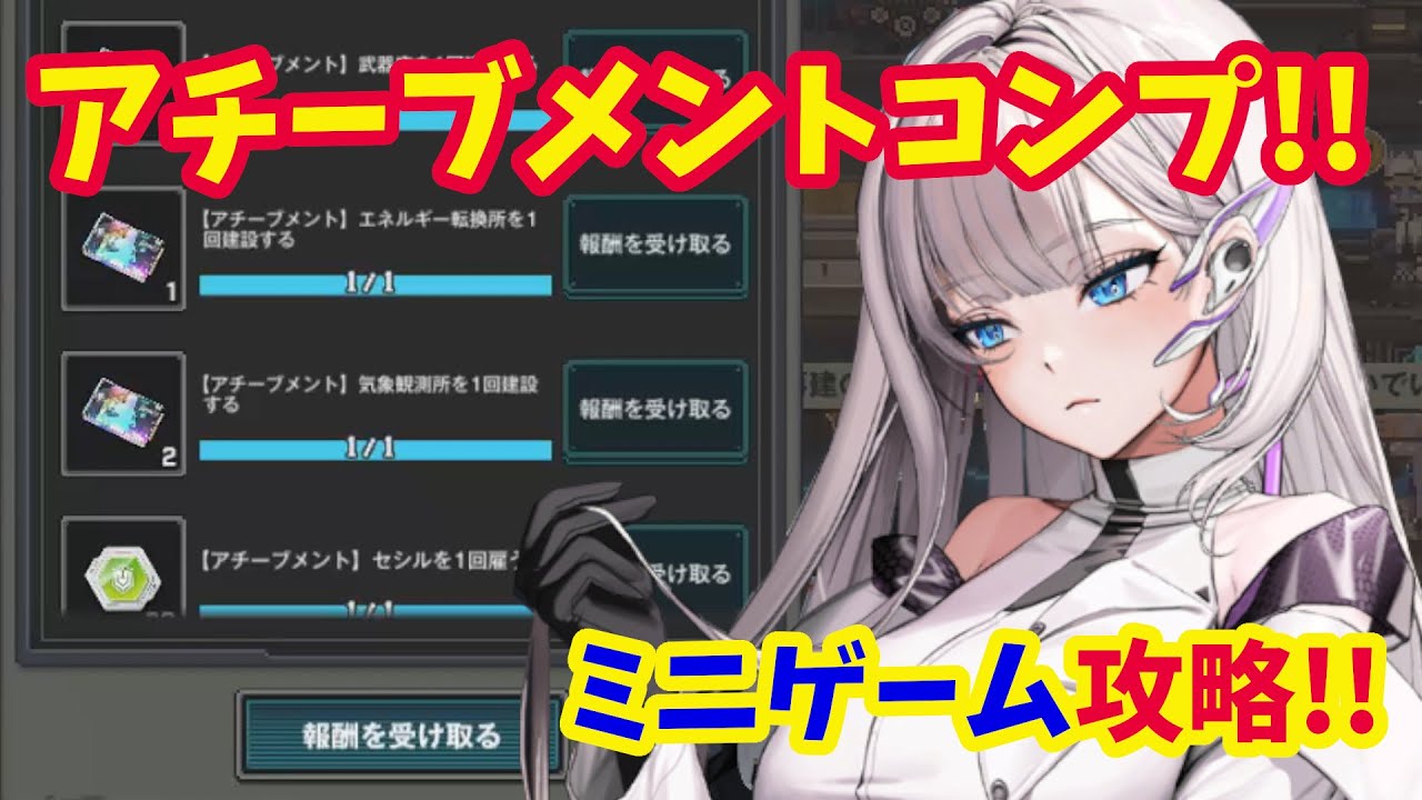 [音楽] こんにちは。一応だよ。 今回は3 周年イベントのミニゲームを攻略していくわ。とりあえず今取れる全部のアチーブメントを獲得したので、それに至るまでの流れと注意点について解説していくわ。ということで、まずは基本操作からね。基本的なゲーム性は相手マスにどんどん施設を建築していき、建設した施設に応じた置報酬を獲得するになるわ。 [音楽] [音楽] 最初は色々と制限があるのでまずすべきことはこの進歩ゲージをクリックしてメインクエストを進めていくことになるわ。ここに表示されるミッションをクリアするのが目標だね。 [音楽] メインクエストのミッションをクリアすることで達成報酬と新たな施設が解放されるわ。 [音楽] これを繰り返していく感じだね。 早速施設を建設してみましょう。最初は発電所とデイリー補給書を設置してみるわ。 どこでもいいので開いている場所をクリック用すると建設可能な施設一欄が表示されるので建設したい施設をクリックすれば建設できるわ。 [音楽] 今回は発電所とデイリー補給書を設置するんだったね。 設置に関しては3 秒ほどで完成するので気軽に選択してね。続いてデイリー補給書も建設しましょう。 建設の流れは以上になるわ。次は派遣任務 について解説するわ。メインクエストを 進めていくと第1縮の建設を求められるわ 。ということで早速建築していきましょう 。 第1縮の建築が完了したわね。第1縮の 建築が完了したら右上にある数値を クリックすることで派遣画面に進めるわ。 派遣の内容はランダムになっているので 好きなものを選択してね。派遣には派遣用 のロボットが2体必要なのでここにセット して派遣を進めることになるわ。編成した キャラの能力はここに表示されるので可能 なら派遣関係のスキルを持ったキャラを 派遣に使いたいわね。 今回は初期キャラだから派遣とは関係ないスキルだね。 またさらにメインクエストを進めていくと派遣に装備を持っていくことができるようになるわ。その場合ここの装備の横をクリックすることで編成面に行けるようになるので装備があるならつけるの持てね。 [音楽] 今回はバールを装備してみるよ。 バールを装備したことで派遣でもらえる資源が 10%増加するようになったわ。 これで派遣効率があったね。 準備が整ったので派遣に出発。 あ、失敗しちゃってる。 派遣を選ぶと成功失敗に関わらずクールタイムが発生するわ。 あと30秒ほど街が発生しているね。 当然この間は待つしかないわけだけど、実はメイン画面の数字を見ることでもクールタイムの残り時間が分かるわ。 右上のこの部分だね。 アチーブメントにも派遣を 50 回実行するがあるので、クールタイムが終わり次第どんどん出していきたいわね。 [音楽] クールタイム以外にデメリットはないもんね。 続いて雇用の説明をしていくわ。雇用には雇用管理書が必要なので建築していくわ。 コストが高めだけど優先して設置したいね。 雇用管理書を建築すると雇用が可能になるわ。 右下にある舞台のアイコンを選択すると 舞台一覧が表示されるので上の雇用を選択 してね。すると雇用可能キャラの一覧が 表示されるので性能と費用を見つつ好きな キャラを選んでね。もしこの中に欲しい キャラがいなかった場合は費用を払うこと でリストの更新をすることもできるわ。 雇用に関しても30回雇うアチーブメント があるので手てっ取り早く達成したいなら コストが安いキャラを選択するといいわ。 今回は生産量が一増加するキャラを選択しているね。 現状だと生産施設がなかったので先に建設するわ。これで生産施設の建築が完了。一定時間ごとに資源を生み出してくれるようになったわ。 [音楽] 1 回で2個ずつ資源が生まれているね。 ここで先ほど雇用したキャラを配置してみるわ。 配置の仕方は施設をクリックして説明を出した後、右上の空をクリックすることで行うわ。早速先ほど雇用したキャラをセットしてみましょう。 [音楽] 生産量が1上がるんだったね。 その結果どうなったかと言うとなんかごちゃごちゃしててよくわかんないね。 [音楽] しょうがないので数値で確認してみましょう。 あ、確かに3増えているね。 こんな感じでキャラを雇用して生産効率を上げていきましょう。続いて装備開発を行っていくわ。装備開発には装備生産施設が必要なので早速建築しましょう。晴れて装備開発施設の建築が完了したわけだけど、これだけだと電力が足りないため稼動効率が落ちてしまうわ。なので隣に発電所を設置して電力を補いましょう。 [音楽] [音楽] でも発電所の電力は 20しかないから2つ作っても必要電力の 75 にならってあれ実は各施設にはシナジー効果というものがあり発電所の場合には基本生産量が [音楽] 20重増加する効果があるわ地の 20にシナジー効果で20プラスされて 40 ずつ電力を供給してくれていたんだめ他の施設も当然シナジー効果がありこのシナジーのヒントをクリックすることで確 [音楽] 確