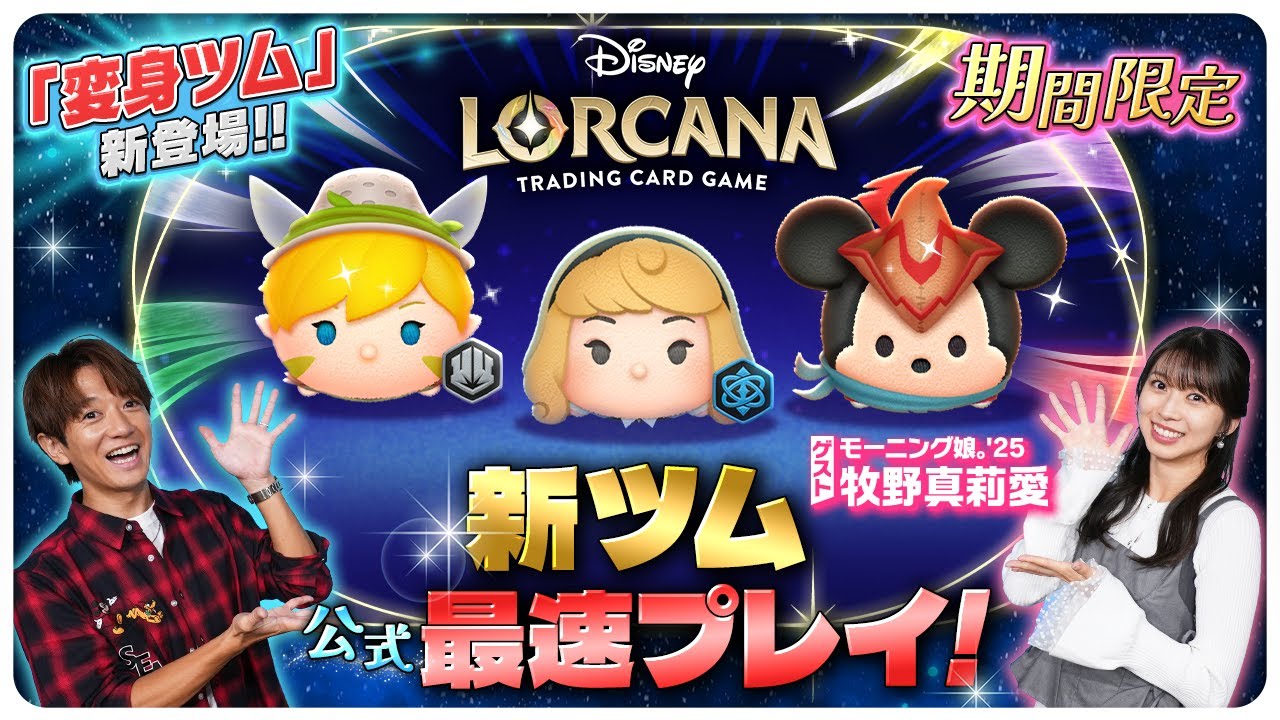 私も待てない人だからな。めっちゃわかるね。 あ、もうこれとかもうダメですね。もう わ、そうね。 あの、できるだけ早く変身ゲージ貯めて変信させることが重要なので早く変身させてください。 呼んでるよね。 変身変身変早く真ん中に いいじゃない。 えい。 あら、 できた。繋げれるボムが レッツ レッツムツム 楽しそうやな。 ディズニーゲーム公式チャンネル ディズニーゲームワールド。 皆さんこんにちは。MCの大倉志です。 今回は11月1日午前0時にLINE ディズニーツムツムに登場する新の最速 プレイとなっております。まずは本日の ゲストをご紹介しましょう。本日のマの マリアさんです。モーニング25のマリア です。よろしくお願いします。 はい、よろしくお願いします。 お願いします。 もう結構出られてますけども、 5回目となります。 はい。ありがとうございます。 どうですか?やってますか?最近は やってます。ちょっと前にあのマスカレードドレスマルス はい。はい。2 回で出ました。 あら、すご なのに。 はい。なのに なのにディズニービランズが全然出ないんです。あ あ、なるほどなるほど。30 回ぐらい引いても はい。やってるね。 はい。 最近もでもイベントがむちゃくちゃ多いじゃない? やっちゃうよね。 はい。 そうなんですよ。で、しかも最速プレイでやる時ってベストな状態じゃないですか? 50 スキルもマックスでレベルもマックスでもうそれが楽しすぎちゃって、 私もう貯めてたスキルチケットをちょっと使おう。 お、ついに排出して 75枚あったスキルチケットを お、75枚もあったんだ。 はい。ちょこちょこ使うように。 うわあ、すげえ なりました。この楽しさが忘れられなくなっちゃいましたね。 はい。はい。ということで本日もよろしくお願いいたします。 お願いします。さあ、それでは11月1日 に登場する新を早速ご紹介していき ましょう。こちらでございます。 ディズニーロルカナトレーディングカード ゲームから期間限でロルカナオーロラ 変身、ロルカナティンカーベル 、そしてロルカナミッキーのツムが登場し ますか?いい かいですね。さあ、今回はディズニー ロルカナトレーディングカードゲームの キャラクターからインスパイアされたツム が登場ということで、まずはこちらの ゲームを簡単にご紹介させていただきます 。 ディズニーロルカナトレーディングカード ゲームはドイツの死ニゲームパズル メーカーラベンスバーガー者が2023年 8月にアメリカで発売し、これまでに全 世界で10億枚以上販売された大人気の ディズニー公式トレーディングカード ゲームでございます。プレイヤーは イルミニアの1人となり、魔法のインクで グリマーと呼ばれる新たな姿のディズニー キャラクターやアイテムを描いて召喚 いたします。そして不思議な世界ロルカナ の秘密を解き明かす冒険に出かけ ストーリースターを巡って他のイルミニア たちと競い合うというストーリーです。 こちら日本では今年1月から宝トミーが 販売を開始していて60枚以上のカードの 束デッキを用意して対戦するカードゲーム となっております。 そしてロルカナの魅力の 1 つはなんと言ってもその美しいアートワークでディズニーアニメーション作品のワンシーンを早期させるものだけではなくオリジナルの世界観や独自の物語を描いたイラストなどこれまで 1000 種類を超えるカードイラストが全て書き下ろしで登場しております。かがでしょう。 こちらディズニロルカナトレーディングカードゲーム。 はい。私トレーディングカードゲームあんまりやったことないんですけど、このロルカナはディズニーのキャラクターがたくさん出てるっていうことで ワクワクしますね。 うん。ねえ、ワクワクするの?今これパッと出てますけどもかがでしょう?気になる。 いや、このベル はい。はい。ベル やっぱ父が発明家だから うん。 その娘も発明してるって。この絵がちょっと可愛いですね。 確かになかなか見ないよね。この発明家のベルっていう。 そう。はい。以上あるんですもんね。 あるわけで、だから他にもいろんなキャラクターのアニメーションのキャラクターがたくさんあるということで さあ、そしてですね、今回ご紹介する新ツムのモチーフになったカードがあるということで見ていきましょう。こちらです。 あら、 かい かいい。 はい。ブライアローズのオーロラ小さな戦術家ベルそしてブレイブリトルテイラーのミッキーマウスでございます。 それぞれ召喚される時のインクカラーが異なり、オーロラがサファイア、ティンカーベルがスティール、ミッキーがルビーとなっております。 ふーん。セリフも書いてあるし、 ブライアローズっていうのはその オーロラが森に住んでた時、あの、身を隠してた時の名前なので、なんかそれもこのカードになってるっていうのがめちゃめちゃ いいです。 ディズニーロルカナトレーディングカードゲームはそれぞれのカードに固有の能力があ
