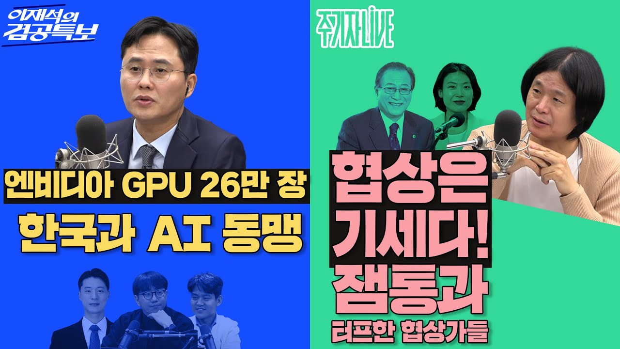 [음악] [음악] [음악] [음악] เฮ [음악] เฮ [음악] เฮ [음악] เฮ [음악] เฮ [음악] [음악] เฮ [음악] He. [음악] เฮ [음악] [음악] [박수] 예, 여러분 안녕하십니까? 이재석의 검투보입니다. 젠슨 황재용 정의선 예 세 사람이 어제 보여준 이른바 치맥핵 회동은 설령 그게 연출된 것이라 해도 예 나쁘지 않았습니다. 젠슨 황의 말대로 한국 기업들과 대규모 계약을 한다면 우리 경제에도 보탬이 되고 예 좋을 것 같습니다. 그런데 하나 눈에 면은 이들이 함께한 행사장에서 환호성을 외치는 객석의 풍경이었습니다. 마치 연예인들의 콘서트 장을 보는 거 같았습니다. 재벌 총수에게 보내는 화노라. 예. 솔직히 좀 개인적으로는 낯설기도 했습니다. 음. 아시다시피 회사를 설립하기 전에 식당에서 아르바이트를 했다는 자수 성가형 젠슨 황과 우리나라 대표적인 재벌 총수들은 그 성장 배경이나 성공 스토리가 예 너무도 다릅니다. 그만큼 어제 그 환호성을 재벌 총수들은 기업의 사회적 책임으로 연결지어서 더욱더 고민해 봤으면 좋겠습니다. 이재석의 경공 투보 시작하겠습니다. [음악] 예. 아, 금요일이군요. 이재석의 경공 특보와 함께 오늘 발생한 소식을 또 하나하나 정리를 해 드리도록 하겠습니다. 한 주가 이렇게 마무리되는데 경주는 뭐 뜨겁죠? 예. 내일까지도 계속 뜨거울 것 같고요. 어, 잠시 뒤에 경주에 나가 있는 박현관 기자도 연결해서 또 오늘 소식 정리를 하도록 할 텐데요. 아, 미디어 인권 연구소 문의 이봉 연구원 저와 함께하겠습니다. 네, 안녕하세요. 이봉입니다. 예, 오늘은 좀 단출하기 시작하네요. 그렇습니다. 아, 이렇게 다른 방송의 영향으로 우리가 외롭게 얘기해 그렇게 얘기하실 필요는 없고. 예. 그렇게 얘기하시면 또 괜히 또 이상한 싸움 붙이면 안 됩니다. 예. 그냥 우리 단출하게 한번 얘기해 보자고. 이봉연권하고 참 글쎄요. 뭐 벌써 방송을 한지도 1년 반 1년 반 돼 가네요. 이제 1년이 넘었죠. 예. 그러게요. 거의 매일 보다시피 이렇게 하고 네. 작년 5월에 시작이 됐습니다. 원래는 네알로 시작을 했었는데 그러니까요. 네. 네. 엊그적는 우리 둘 다 경찰서에서 조사도 많은 일들이 그 사이에 있었네요. 내란도 터지고 개엄군도 막다리고 아 그 개엄군을 밖에 두고 생방송도 하고 이봉연은 개엄군을 실제 눈앞에서 이렇게 대화도 나누고 아무튼 그렇습니다. 그 1년 반 사이에음 많은 일들이 있었고 네 그런데 동접자는 상당히 많이 올랐고 초반에 비하 그렇습니다. 우리 처음에 1만 명 되면 되게 기뻐하고 그랬어요. 그러니까요. 네. 음. 많이 성장했어요, 우리가. 아, 그렇죠. 예. 우리 제작진 분들하고 앵커님들 그리고 많은 출연자분들 덕분이고 음. 그 생각해 보면 되게 근데 신기하기도 한게 우리가 작년 5월 6월에 시작할 때 그때 쌍방울 대북 송금 사건 그리고 윤성열 정부의 공영방송 장학 MBC YTN을 향한 공격 요런 걸로 우리가 초반에 스타트를 했었거든요. 놀랍게도 그게 아직도 비기슈라는 것이 아 예 정말 놀랍습니다. 마무리되지 않는 이슈 그렇습니다. 아 뭐 오늘 고별 방송 아닌데요. 갑자기 이렇게 좀 어 이봉 연관하고 단둘이 이렇게 있다 보니까 아 저 화면도 저렇게 이른바 투샷 두 명만 이렇게 딱 나가니까 이런저런 옛날 생각도 나서 나서 이렇게 얘기를 해 드린 거고 네. 어 아까 그 경찰서 조사받았다는 거는이 방송 내용을 가지고 모의원이 예 국민의인 모의원이 저와 이봉호 연구원을 또 고소고발을 했어요. 명예훼손이라고. 예. 그런데 당연히 뭐 말이 안 되는 내용이고요. 저희 이제 무혐이 처분을 받았는데 최근에 예. 그런데 경찰서 조사까지도 저와 이봉호 연권이 받았다는 말씀. 저희가 이제 뉴스 브리핑을 하다 보면 듣는 정치인들은 불편할 수 있죠. 예. 불편할 수 있는데 언제든지이 자리는 열려 있습니다. 예. 반론권 있고요. 뭐 전화 연결도 좋고 인터뷰도 좋고 언제든지 나온다고 하면 우리는 열어 두고 있습니다. 연락 주십시오. 그니까 막 고소고발할 생각하지 말고 언론은 항상 그렇게 적극적으로 대응하고 반론을 펼치면 된다. 예. 그걸 다시 한번 좀 말씀을 드리겠습니다. 뭐 어느 정치인이다 이렇게까지 뭐 얘기하고 싶지 않고. 음. 그 경찰 조사받은 뭐 이제 끝났으니까 우리가 얘기할 수 있는 건데. 네. 한 가지 재밌는 에피소드 말씀드리면 그 같은 사안으로 이재석 기자님이랑 제가 같이 고소가 됐는데 그 경찰서 사건 배당이 저희 집 바로 앞에 있는 경찰서로 배당이 됐어요. 이상하잖아요. 안 이상한데. 그래서 제가 조사받으면서 경찰을 그 조사관한테네 이게 이재석 앵커는 집이 멀다. 여기서 처음에는 원래 다른 약간 우리 둘 집에 중간쯤에 있는 경찰서로 원래 고소가 됐었거든요. 아 얘기해 돼요. 영등포 국회가 있으니까 고소가 됐었는데 이제 저희 집근처인 광명 경찰서로 이제 됐단 말이죠. 전 진짜 가깝습니다. 주피이자니까 그 얘기를 하더라고요. 그 아니 이재성인코는 집이 뭔데? 왜 여기 광명으로 왔어요라고 했더니 경찰관이 아 고소인께서 주 신고인으로 주고소 피고소인으로 이봉훈 씨를 지목해서 그렇다고 이봉훈 씨 이봉우 연건이 이제 집이 광명