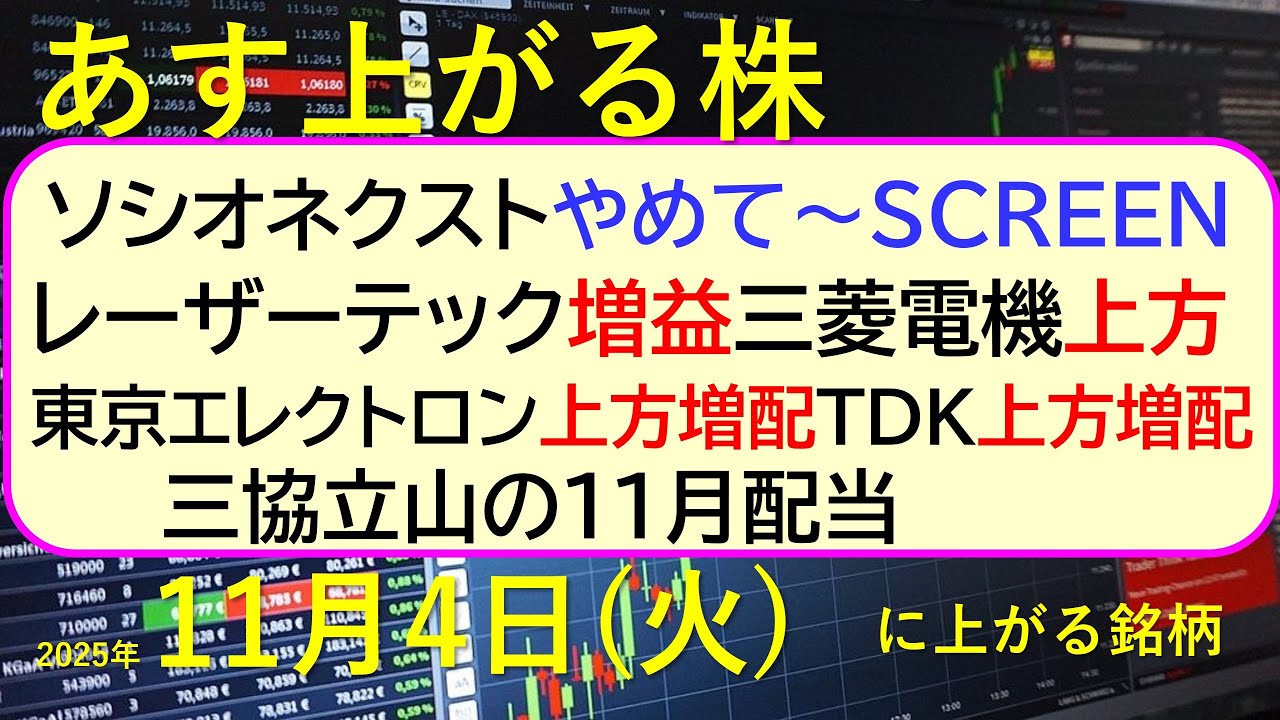 あす上がる株 2025年11月4日(火)に上がる銘柄。ソシオネクスト、SCREEN、レーザーテック、三菱電機、東京エレクトロン、TDK、など大量決算!~最新の日本株情報。高配当株の株価やデイトレ情報~