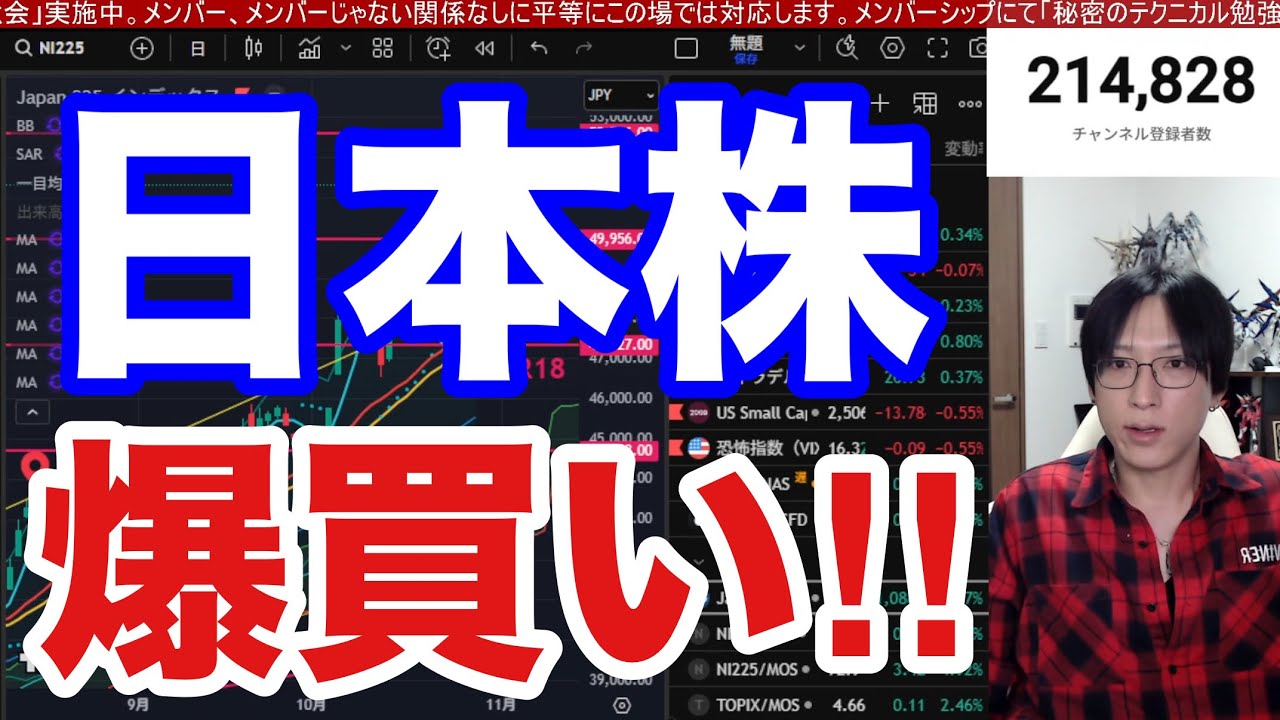 てきましょっか。で、日経兵器がま、 止まらないというところでね、今日も線 上げてるからね。やばいっすよね。もう 空売り勢が丸コケ状態もこれがついてる 限りは、え、なんだろうね。うん。で、 もう下げてくる際はもうあそこを見ておく しかないっていう状況になり下がってるん ですけども、ま、とりあえずね、あの、 今週1週間終わったし、かなりね、 やっぱし皆さん利益取れてる人多いと思う んですよ。あたりもね、緩くめて、あの、 雑談間違えながら今日はライブ配信やって いきましょう。皆さんこんばんは。 よろしくお願いします。と。で、僕は ちなみに、えっと、2013年から7年間 証券会社に勤めていて、最終本店まで行っ てます。で、ボーナス狙って毎年社長撮っ たり、ま、実務経験しっかりと積んでるし 、え、バイクも大好きなので、え、同じ 趣味の人よかったら、あの、チャンネル 登録と高評価ボタン押しとってもらえると 嬉しいのでよろしくお願いします。ちなみ に、あの、アイコンは僕本人です。はい。 あとメンバーシップでテクニカル分スの 勉強会もやってるので、 今以上に本気で力をつけていきたいという 人がいたら入ってみてください。えっと、 ちなみにメンバーさん明日の夜10時から メンバーライブをするので、えっと皆さん スケジュール管理だけはお忘れないように よろしくお願いします。あとメンバーに 検討してる人がいたらね、ライブ中にね、 入ってもらえたら僕名前覚えることできる んで、あの、嬉しいです。よろしくお願い します。というわけで、皆さんこんばんは 。改めまして。さ、やってこっかね。 ライブ配信ね。やばいね。さっきも言った けどさ。え、全く止まらんぜ、本当に。 日経平均1085円だが、え、受給9よし 。万道終了の万道だし優意日本株に傾い てるし、海外勢も買ってきてるし、え、 もうあのやれてますよね。空売り勢がね。 とかでもなんかあのコメントが流れてきて ますけど愛情みたいな感じでさ、やっぱ愛 に空売りしてしまうとそういったことに なってしまいかないのでやっぱ注意が必要 ですよね。もちろん買い物注意が必要なん だけどそれ以上にやっぱリスクは高いので カラ売りはですね。 で、えっと、一応アンケートもやってるん でそれに添いながらやってくんだけど銘柄 分析もま、今日金曜日だしまったりとやっ てきましょう。Aさん今検査良かったね。 あ、PTS上がってるもんね。はい。テク 持ってる方おめでとうございます。その 反面あの東京エレクトロンとかスクリーン とかはちょっとPTSで下がってると思い ますけど。はい。出すってところでね。 えっと、2デック。はい。下落方向に万足 ですね。うん。やばかったね、これに関し ては。え、 これどうなるんすか? ミックはまあここの安値近兵まで来てる からね。 大手の悪材料変れすけどね。普通だったら でもそれ以上にやっぱ信用の投げ売りだ もんだ。なんだもんね。インデックスから 外れだから、えっと、ファンドの売りも 入ってるしダブルでちょっと重たい状況だ から、ま、万読終了のサインが出るまでは ね、下がり続けるのかなっていう、そう いうパターンだよね。で、えっと、一応 フィオナンチのラインも引いとくんです けど、 こういった感じね。 レッドゾーンなんすよ、ここが。はい。ま 、そこ辺りちょっと意識しながら見てく 感じかな。 こでもしここを割ってくるならこっちと こっちのフィボナチになるんでいうこと ならばレッドゾーンはあの1200とか そこあたり行くんだけどそこまで下がる かっていうところであるよね。あの 2016年近辺の はもう下がっちゃってるんで2016年来 の安値かまで今下がってるんで こんな感じかな。はい。 月末は今月。あ、そうだ。今日月末だ。 31日だ。あのいいんじゃない?つった。 えっと、ちょっと待って。ま、アンケート ね。そうだね。一旦終了するわ。えっと、 今週1週間で利益取れたい人多かったん ですけど、今月1回1ヶ月間だね。 アンケートしましょう。えっと、リレク獲 されましたねって。えっと、トリプルB でしたっけ?えっと、ポン ケツ 、えっと、実理 組増えた人のアンケートね。回復 に、え、危険。みんなどうやった? 金額も入れてよかったらこれおめでとうっ て言いたいわ。どんだけ儲かったのか教え てください。 え、俺今月やばかったぜ。マジで 笑いがつまんなかったっすね。 ちょっと待ってね。アンケート出します。 こんな感じですね。えっと、今月1ヶ月間 で皆さん実理含み駅どれだけ増えました かって、ま、増えたかどうかアンケート ですね。はい。福駅源含み様子見のこの4 択でいきましょう。はい。 あ、ハロウィンだって。そう、ハロウィン やね。今日あの大阪はもうね、雨ですけど ね。うん。大阪雨で寒いから残念な天気で はあるかな。例年やったらやっぱし 同り当たりとかすごい人で賑合ってね、 あの、仮想してる人とかも多いんでしょう けど、ま、さすがにね、天気