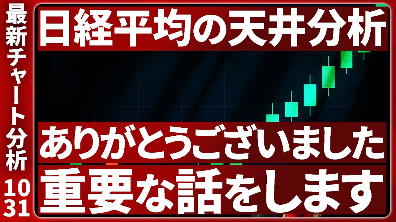 [音楽] はい、皆さんお疲れ様です。本日もニアのカブチャート研究所やっていきたいと思います。現在の時刻が 10月31日、え、午後4 時前に取っています。はい、今月ですね、 1ヶ月皆様、え、お疲れ様でした。 10月ですね。はい、僕もですね、え、 今日、え、出す動画のタイトルですね、 サムネにもある通りですね、日経平均株価 の、え、天井の分析、え、今日大まかな タイトルですがね、話していきたいと思い ます。かなり重要な話になりますので、 是非ですね、今株式トレード、え、及び ですね、現物の投資をやってる方にも、え 、是非聞いていただきたい内容ですし、え 、今日の内容ではですね、え、個別株の 色々分析はしないですが、え、個別株を ですね、触る方もこの日経平均、え、 めちゃくちゃ重要な指数になりますので、 え、必ずですね、最後まで見ていただけれ ばと思います。そして、え、今日ですね、 え、ありがたいことにですね、チャンネル 解説からもう約1ヶ月が、え、経過しまし て、え、最後にはですね、皆さんに対して 、え、かなり、え、お知らせというかお話 、重要な投資をする上でですね、え、必要 なマインドセットのお話していこうかなと 思いますので、え、是非最後まで聞いて いただけたら嬉しいです。まずはですね、 え、もう、え、既にずっと僕の動画をです ね、え、1週間、2週間、3週間と、え、 見ていただいてる方はもう、え、ご存知か なと思いますが、ま、日経平均ですね、え 、ずっとずっと上でですね、見ていきまし て、え、ずっとね、押し目とかも解説して いったので、え、多くの方がですね、 おそらく乗れてるんじゃないかなと思い ます。で、食金もですね、え、例えば1 週間前ぐらいを振り返ったとしても、ここ 、え、りはして上とかですね、ここも、え 、耐えて逆三ゾで上とかですね。この辺り も一旦、え、5万178 で一旦、え、レンジ部分で下げていきます みたいな話もして、一旦下げてきてから、 え、上とかですね、ま、色々ね、え、 NASダックダウ、え、日経と色々、え、 指数見比べながらですね、え、やってるの でかなり精度が高くですね、え、保てて 発信できてるのかなと思いますが、え、 今日はですね、皆さん、え、気になって いるのがおそらく中長期的に日経平均、え 、どれだけ上がっていくのかという話だと 思います。ま、実際に1ヶ月前僕が YouTubeを始めた時ってもうここ 10月、ま、え、9月の末とかでしたので 4万、え、4000円台とかだったんです よね。それが今もうすに1万約1万円ほど 上がって5万もう2500と、え、かなり 強いね動きで上がってる中で、ま、皆さん が気になるのはこれどこまで行くのかって いう話だと思うので、え、これをですね、 今日の動画では、え、僕が、え、考えうる 、え、上位足でのですね、え、調整が来る のか、え、それともこのまま上昇が続いて いくのかといったところを話していきたい なと思います。ちょっとね、このチャート だと、え、ゾーンだったりとか水平線が、 え、多くありますので、ちょっと見にくい かなと思いますので、別の、え、チャート に移します。はい。でですね、週足見て いただくと分かるように、え、このような 形でですね、ずっと上昇しています。で、 え、こういった場合にですね、見ておか なければいけない1つの指標として、え、 上昇の計算値が、え、存在するんですが、 え、これをですね、週足で引いていった時 にですね、面白いデータが出てくるんです ね。え、例えばなんですが、え、こちら ですね、え、計算値で引いていった時に、 え、マックスの上限値で引いていくとです ね、例えば、え、5万5000、え、 227円付近まで上昇するっていう形に なるんですよ。で、え、皆さんね、多くの 方、え、あまりテクニカルを意識してない 方、こんなの当たるのっていう風に思うと 思うんです。でも実際、え、皆さんに見て いただきたいのは例えば Micクrosフtとかですね、え、見て いただくとですね、え、以前ここから、え 、高値2021年から、え、2022年、 え、ここ大きく下げました。そして大きく 上げましたね。え、ここのじゃあ値幅と かってどうやって取るのって考えた時に 上昇の起点からしっかりと高値まで測った 上でしっかりとプライスアクション持って くると高値まで結、え、結局来るんですよ 。なんでかって言うと、え、すでに相場と いうのは、え、テクニカルが意識された 値動きがずっと続いているからなんですね 。これもMicクrosoftもそうです し、他の、え、銘柄見てもそうです、実際 。なので、え、僕はですね、普段から テクニカル分析だけを見ておけばオッケー と話していますし、え、移動平均線だっ たりとか、え、その他ですね、MacD、 RSIとかオシレーターとか含めてですね 、色々インジケーター世の中に存在してい ますが、え、ロソ足だけ見てれば十分なん ですね。なんでかと言うと、え、全て過去 の、え、データを収束したものでし