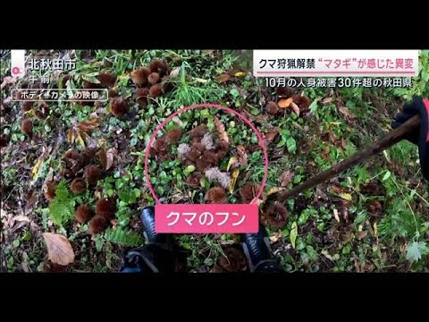 関水し川のようになった国道230号 3連休の初日北日本は大荒れの天気となり ました。 道路脇には水がかなり溜まっていて前が 一瞬見えなくなります。 北日本を中心に100地点以上で6時間が 11月として1位となりました。 雨だけでなく激しい風も吹きつけます。 台風並に発達した低気圧の影響です。 最大瞬間風は北海道御崎で49mを超えた 他、 青森県八の兵士でも36m以上を観測。 樹目が倒れたり、収穫が始まったばかりの りんゴが落ちたりするなど被害が出ました 。 [音楽] 一方の関東は後落。 今日サタデステーションが訪れたのは東京高尾山さ。紅葉はほんのり歯が色き始めていますが、見頃はもう少し先になりそうです。 リュックの後ろに鈴がついています。クをつけている外国人登山者などもした。 周辺でクが出ていると聞いたから自分用に小さいのを買ったんだ。結構大きめ屋の音で、あの、結構遠くにいる人も気づいてくれるんで重宝します。周りに人いなさそうだなって思った時は、あの、なんか自分であの、おいって声出しながらあの走たりしてますね。なるほど。 [音楽] [音楽] 隣町の東京野市は 3日前に熊が失没したばかり。 の方にしていただいと思います。 はい。この地域に住む南沢さんも熊を目撃したと言います。 これがえ、この柿の木に登って柿を食べてました。 10月の6日ですね。1 ぐらいですかね。はい。罠仕掛けても入らないんで。ええ。 [音楽] いや、やっぱり早く駆除してもらいたいですけどね。 東北では熊による人身被害が増え続ける一方です。福島県大玉村の勇社では昨日餌やりをしていた男性が熊に襲われ不傷。周辺では今朝にかけて熊 2 等が駆除されましたが男性を襲った熊かは分かっていません。 [拍手] 被害にあった男性はこちらの車で電気をつけたところ 2 等のクがいてが向かってきたということです。 勇者の1番奥の方にその餌を食べていって たみたいに熊の方からこう向かってくる ような状況だったんで、ま、危険だって いうことで、ま、その、そこで発砲したん ですっていう 山形県南市では今朝市の職員が熊に襲われ 、右手を骨折する重症を追いました。 現場近くの小学校では3日前。玄関の ガラスが熊に割られるなど没が相ついでい て、この職員は別の職員と2人で警戒に 当たっていました。 去年は0だった10月の人身被害が、今年 は30件以上も起きている秋田県。 今日から月和やイノ市などの狩猟期間に 突入しました。 番組が訪ねたのは北市で漁師をしている松さん。 江戸時代から続くまの家計に生まれ、現在 16代目として修行中の実です。ありまし 今年から量に持っていく道具が増えたと言います。 さんは はい。最近はくマスペでも持っていくようになりました。 タオル本当に今までのまくマの生体から予想がつかないような動きをしてくるのでそういうのに対するにはもう今までの領具ではどうともいかないというところで はい。 こういう 今期初めての量に向かうと早速異変がイノシや用の罠を仕掛けようと栗林へ入った時でした。 これク食べてますね。ちょっとこっちはかけるのやめておきます。ここら辺がこれとかもそうですし、これとかもそうなんですけど、熊の糞なんですね。ですかね。 想定以上だったクの痕跡。 熊がいるところにはイノシ近寄りたくないし、イノシいるところには熊近寄りたくないして、そういう関係性だったのが、ま、今回ので結構明確になったのがもう競争はばっちりしてるなっていうところですね。 かなりちょっと以上かなと思います。 熊対策が漁子だみになっている現状にも危機感を募らせていました。 で、募集かけて免許を持って銃を持ってっていう人が増えてもライフル銃を持っていざと立ち迎えるのは 10 年後なので、まだまだその間にクも数を増えても近くなってくるでしょうし。 昨日秋田県小が市で熊が目撃された場所は 山から6km以上も離れた海岸沿でした。 え、この辺りでは連日熊が目撃されてい ますが、近隣住民の方によると箱穴の数が 足りず未だ設置が進んでいないということ です。 脇田市内で住民に話を聞けば必ずと言っていいほどクを見たと言われる状況です。 これ見せて 庭のかきの実みをクに食べられたという人は [音楽] 怖いけどもおい年齢が年齢なもんだから うん 薬ることもできないすね。 うん。 そのまましておいでるの。ああ、 こうした状況を打開するための対策がキッチで進められているところもこちらの河線敷では重機で草崎を踏み倒す作業をしているようです。 [音楽] 新潟県川村の河川式周辺では熊の目撃情報 が相れ 場所になっている河川式の草を重機で 踏み倒う作業やくみの木を伐採していまし た。 9月上旬時点ではまだ、え、数筒の目撃 だったんですが、10月に入って急激雲の あの村全体においても出没が、え、増加し てきたもので、え、10月入りましてです ね、え、村から要望したものです。 3連休の自由に過ごせない町もありました 。 こちら南都市です。熊の目撃。 