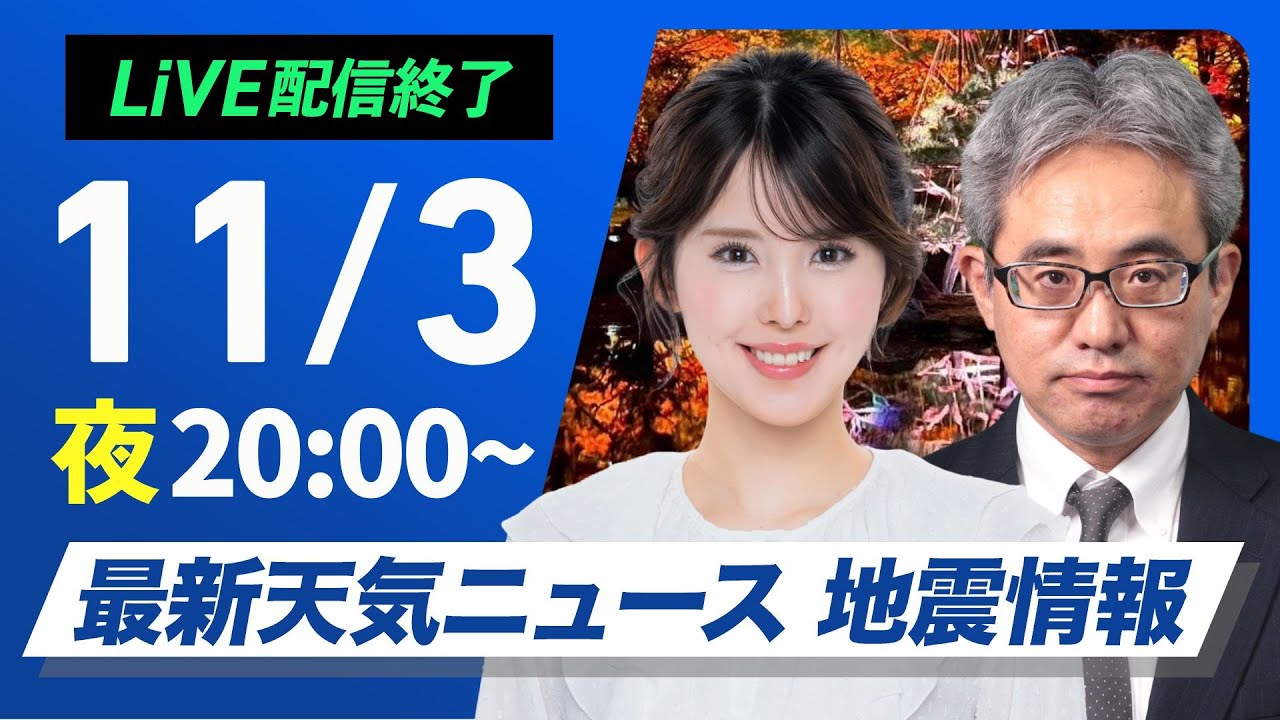 【ライブ配信終了】最新天気ニュース・地震情報 2025年11月3日(月) /鹿児島県で地震相次ぐ〈ウェザーニュースLiVEムーン・小川千奈/本田竜也〉