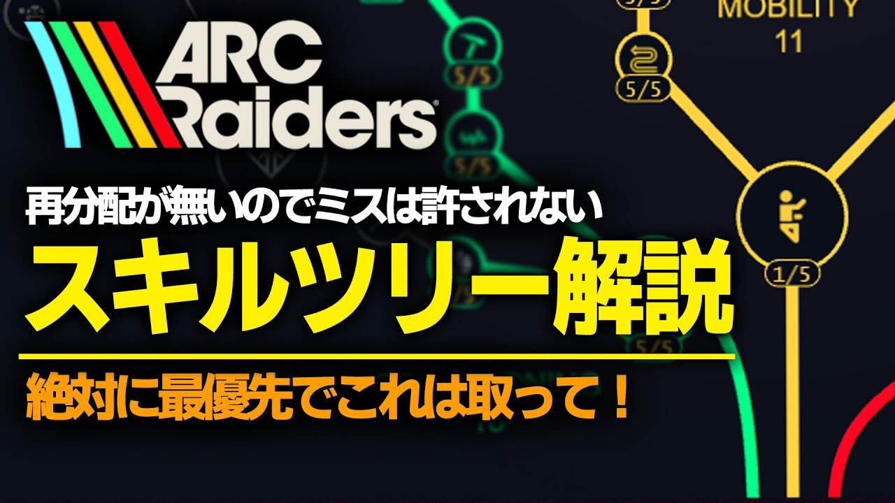 はい、お疲れ様です。けまです。今回なん ですけども、アークレイダーズのスキル ポイントについて解説していきたいと思い ます。はい。えっとですね、このゲーム スキルポイントのリスペクがないんですよ 。振り直しっていうものが存在していなく て、ま、一応できるっちゃできるんだけど 、それは本当にキャラクターの完全消去に 近いようなシステムを使わないといけない んで、ま、基本的に今皆さんが遊んでいる キャラクターで、え、スキルっぽいの リスペクト、え、再分配をしようと思って もできないので、めちゃくちゃ慎重になる 必要があるっていうゲームなんですよね。 ゆえに、え、これ僕もすでに失敗してい ます。失敗しているんで、え、その失敗 経験も含めて、え、こんなスキルツリーを 取ってったらいいんじゃないかなっていう のをちょっと皆さんに紹介していきたいと 思います。というわけで今回もやっていき ましょう。このチャンネルね、毎日ゲーム 関連の情報バシバシ発信しております。今 はね、アークレイダーズ楽しんで色々ね、 攻略動画出しているんですけども、他にも 面白いインディーズゲームあったよとか、 え、最新のゲームのレビューとかこの ゲーム買うか買わないかとか、え、ゲーム にまつわる話ずっとやってるんでよかっ たらね、最後にでもいいんでチャンネル 登録と高評価よろしくお願いします。さあ 、というわけでやっていきましょう。 ちなみに僕の今のスキル3こんな感じなん すけどめちゃくちゃミスってます。え、ま 、ミスってるというか、ま、ミスではない けど取る順番がちょっと良くないよね みたいなところが若干、え、ちょっと 気がかりなところなんですけども、え、 ちょ式にどういう感じで取った方が、ま、 効率いいよねとか、え、これは最優先で 取った方がいいよねっていうスキルが、ま 、明らかになったんで僕の中ではい。そこ ら辺の経験含めて話していこうかなという 風に思います。今ネット上にね、あの スキルシミュレーターみたいなやつがあっ たんで、それを使ってちょっと解説をして いこうと思うんですけども。はい。え、 こんな感じになります。え、そうですね。 ま、ちょっとなんか見た目的に若干、え、 違うというか、あの、縦向き方向伸びてる んだけど、3つのあの、スキル3がね、な んですけど、え、ちょっとこれで解説して いこうかなと思います。これマウスカスル 当てちゃうとね、英語になっちゃってるん ですけど、ま、そこはちょっとあの、僕の 中で解説するんで大丈夫です。はい。まず は初手としてここ1ポイント振りましょう 。え、これは移動のカテゴリーですね。1 ポイント振ってそっから左側に、え、11 と振っていった後にこれを、ま、まずは5 まで伸ばしていきましょう。はい。ま、 これがかなり強くて、えっとですね、ま、 スキルの内容的に言うとマラソンラン ナーってやつと、え、最大スタミナが増加 するっていうこの2つのスキルなんですよ 。で、このゲームもう信じられないぐらい 、え、もうスタミナを酷使しながらマップ 上をかけ回るゲームなんで、え、スタミ ラっていう要素はとにかく、え、ま、本当 に探索するにあたってもことPVPにおい てもなんなら普通にそのAIの敵と戦うに しても全てにおいてスタミナがすごく重要 になってくるゲーム性になっています。な ので、え、この最大スタミナを増加するっ ていうの、え、スキルとあとは移動の消費 スタミナが減りますよっていうこの2つは まず最優先で絶対に上げ切ってください。 はい。そしてその後の、え、動きなんです けども、え、スリップスライドってやつを 1ポイント取りましょう。ま、ここ1 ポイント取って、さらに上にもう1 ポイント取って、で、この時点で今13 ポイントなんですよ。で、1番欲しい スキルがこの落ち着いた散歩ってやつで、 15ポイントまでこの移動性のスキル3に 振らないと解放できないんですよ。だから 僕はこんな感じに取っていて、えっと、 頑丈な足首、え、落下してもダメージが 少なくなりますよみたいな感じのものを 取っています。案外ね、このゲーム交 飛び降りることが多いので、ま、緊急性の 高いことが起きたりすると、ま、そんな こともあるので、ま、損はないかなと思っ てこれに振っています。というわけで、 ここにね、3ポイントを振ると、ま、マン をじしてここの、え、大きなスキルを取る ことができます。ま、え、こっちの画面で 言うと、え、これですね、落ち着いた散歩 に行くことができます。だから、え、 ポイント的にはこんな感じ。え、左側に 55と取って、え、そして右側に131 みたいな感じで取ってあげると、え、ま、 この移動に関するスキル3は大丈夫かなと いう感じですね。それより上に関しては僕 もちょっとどれか取ろうかなと思って なんか色々やろうと思ったんだけどどれを 見てもいまいパッとしないというかなんか その資活問題じゃないようなものが多