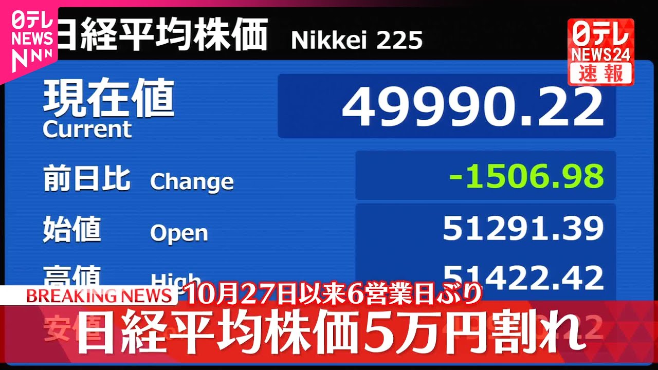 【速報】10月27日以来 日経平均株価5万円割れ