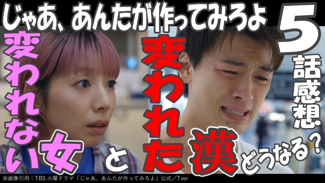 今日もご覧いただきありがとうございます 。エンタメは生きるモチベーション エンタメウォッチャーの今です。TBS 火曜夜10時火曜ドラマ。じゃああんたが 作ってみろよ。5ア話の感想です。髪の色 やファッションは変えても本質はちっとも 変われない。女歩みと体の全細胞が 生まれ変わったんじゃないかというほど すっかり変わった男夫。そして近づいたら ダメな男み今回5アも兄弟愛料理あり乱 ありで最後まで目が離せない展開でしたね 。面白かったところであんたがファンなら もう当然持ち肌ザらしスタンプチェックし てますよね。なんだか微妙なんだけど使い たいっていうね。いや、でもこれドラマ見 てる人同士じゃないと通じないですけれど もね。オリジナルグッズも結構充実してる し、蓄前にと和風ooトマトカレーの オイシックスキットまで売ってるんですね 。すごいな。商売ある系のドラマですね。 そしてなんと今回つ木のミュージシャンの 忘れられない元彼で復活したての彼氏役に ミュージシャンの石崎ヒドラマ パリピ公明も出られてましたけどなんか この不慣れ感が逆にリアリティありました よね。 助著席に元カが乗ってるのを目撃して しまい偉く落ち込んでいるとなんとその元 の家に連れてきちゃう港。これはもうあり かなしかで言ったら完全になしですよね。 男友達だとしても嫌だわ。だから港は 1人暮らしだったら普通にいろんな元可能 とか一元さんとか連れ込んでそうですよね 。この男。歩みが焼いたパンはカチカチ。 微妙な感じの歩み。この男はまあ1人の人 に縛られたくないということなんでしょう ね。自由恋愛マン港一方営業マに新製品の 説明をする活動。なんかこの勝ち誇った顔 に安心感すら覚えますよね。しかも南川の 爪が長いとリモコンに傷が入ったらどう すんのと注意。ま、会社側から見たら自社 製品を大事にするマインド素晴らしいって なるんだけど何よりリモコンが大事な カツオなんかカツオって結局こういうとこ あるよね。フォーカスのポイントが ちょっとずれてると言ようか、歩みがやっ てくれること自体よりその結果の料理に フォーカス当てたりさ、こだわりポイント が独特なんですよね。ま、それでこそカオ なんだけど、なんか1話2話あたりの傲慢 さも多少復活してて逆に嬉しい。すると リモコンに復讐されます。これどういう 状況っていうね。ドラマ市場かつて便器の 蓋に挟まった男がいただろうか?いや、い ない。いや、ちょっと伝説会でしたよね。 いや、この場面が欲しいから衛星機 メーカーの社員なんじゃないかっていう ぐらいには名場面ですよね。南川さんも わざとやっているわけじゃないですしね。 いや、ここは笑ったわ。兄から着信があり 、嫌な予感がしたのか。後輩2人を七問屋 に誘うカお。すると南川はパックしながら アニマル動画。白崎は冷凍庫の下とり。 こういうので飲みの誘い断れる時代になっ たのか。令和時代最高。先輩の誘いは下な のか。うまいこと言うな。カツオ。大体 会社の上司の誘いなんて下以上はないです もんね。一般的に。で、先週の予告でも出 ていたカツオ全体的に彩取りが足りんなと いう兄のセリフ。まるでちょっと前までの 自分を見ているようなんでしょうね。 しかもカツおは幼少期は弱っちい男子だっ たことが判明。それであの頑固にビシバシ やられてこうなっちゃったんでしょうね。 だから言ってみたらカツオは悪くない。 半分は親のせいだ。歩ゆみと別れたことも 言い出せないカツを親父とエビカ兄弟って そっくりですよね。やっぱり本当に親の 教育って洗脳ですよね。まあこんなんじゃ 若い人には嫌われちゃう。カツおって最初 は本当にひどい男だなと思ってみてました けど兄もその上を行ってるしび父に至って は神レベルな強烈さ。いや、私も仕事で 以前九州によく行ってたので、九州男事 って確かに昭和から買えない感じの方、ま 、特に年配の方、ま、若い方でもいたかな 。結構いるなという印象だったんですが、 今でもそうなんですかね。九州の方いたら 是非教えてください。ま、九州でも県とか 地域とかによるんですかね。ドラマ内で出 てきた大分のザビエルは美味しいですよね 。ま、私個人的には博多の通りが大好きな んですけど、ま、食べ物は全般美味しい ですよね。ごサバとか本当大好きです。 九州は美味しいものいっぱい。ここでは奥 さんとうまくいってなさそうな悩んでる 雰囲気の兄が心配になるカツお。美味し そうなワンプレートのご飯を作ったのに港 もあゆちゃんの好きそうなのと言って 食べ物を買ってきてしまう。ここは意思の 疎通ちゃんとできてないと無駄になっ ちゃうよね。手作りをそれほど ありがたがらない港。その時霊の元かの こうちゃんからまた近いうちに会おうよと メッセージ。いやあ、これないわ。そして フォエバーラブはテルをやっぱり着てた。 しかも若めぐるぐる巻きついちゃってる じゃん。最高すぎるわ、このドラ