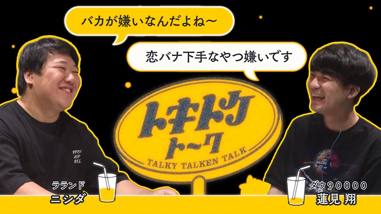 ファミレスを舞台に時間が溶けるトークを繰り広げる「トキトケトーク」。今回はダウ90000蓮見翔×ラランド ニシダ。どうしても好きになれない人についてトーク。飲み会に勝手に彼女を連れてくるやつ論争。自分がもう恋愛できない人に限って紹介したがる。他人の恋愛に興味が持てない。恋バナ下手なやつが嫌い。側で武装するバカが嫌い。生活が苦手過ぎる。公共料金の督促状の色は冠位十二階。