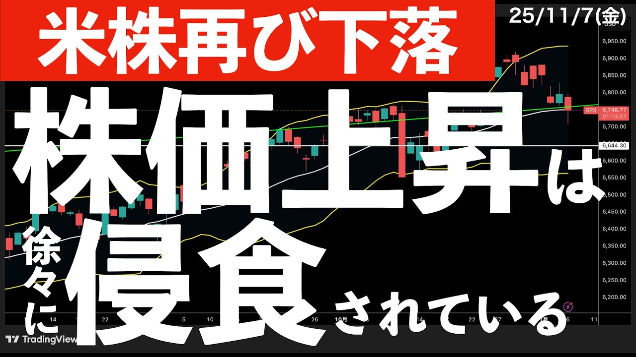 おはようございます。森口でございます。 今日もよろしくお願いします。今日は11 月7日金曜日米株再び下落株価上昇は徐々 に新食されているということで話をして いきたいと思います。後ろに表示してるの はS&Pコ500役の日足チャートで、 ちょっと割り込んで欲しくないところをね 、割り込んできたなという印象はあります 。ま、これだけでも新食っていう言葉が、 ま、多少は合ってるのかなという風に思う んですけど、ファンダメンタルズでも気に なるニュースとかもあるので色々ご紹介 できればと思っております。よろしくお 願いします。ということで、この チャンネルでは最新の状況を取り上げた上 でのテクニカル分析を必ず前朝時目標で 更新をしております。なるべく耳で聞いて も分かるような形で、なるべく分かり やすい言葉を使って解説を続けていきます 。ま、優し更新毎日チャート分析 チャンネル、チャンネル登録を是非 よろしくお願いします。それでは早速昨日 の振り返りから入っていきましょう。まず 昨日の日本株ですが高安ちまちの結果と なりました。未経平均トピックスは反発と いう形になったんですけども、その前まで の下落分を取り戻すというほどでもなかっ たので、ちょっと物足りないなっていう ところやそれでいて日経平均先物がまた 500円前後下げているというところなの で、ちょっと心配だなという印象はあり ます。昨日はある程度値上がり銘柄数が 多くって上がってる銘柄の上昇率も高かっ た中でも藤倉は今日決算発表なのに 9.74%も上がりほぼほぼ市場最高値と 並んでいるような状況にあります。陽種別 ランキングでも秘鉄金属が軍を抜いていて 藤倉決算後の動きはちょっと注目度が高い かなという風に思っております。アメリカ 株チェックしていきましょう。4時12分 時点で再びマイナス。中でも やっぱりナスタックが弱いですね。1%を 超えるマイナスになっています。欧州株も 今日はちょっと弱いでしょうか。ドイツ フランス1%を超えております。業種子別 のヒートマップ見ていても下落の業種の方 が多いですよね。今日は情報技術や一般 消費とかね、ハイテク関連とか弱いなって いう印象を持ちました。セールスフォース やNDIA他にも反動体関連弱い銘柄が 目立ちますね。その結果日経平均先物は マイナス大体500円前後といった印象 でしょうか。為せは153円の08線恐付 指数は20を超える場面もあり、これが 継続的に20を超えてくるようだと心配 です。今日は長期金利が低下をしています 。これは経済指標によるものかなと考えて います。原油が60を割れてますね。一方 金は4000を超えていますが、大体この 辺で推移が続いております。また今朝は 暗号資産が比較的大きなマイナスとなり ました。これも昨日大きな反発をしたん ですが、まだ不安が残ってるということ でしょうか。それでは見ていきましょう。 米株半落上昇トレンドが少しずつ侵食され ていると感じる点ということで話をして いきたいと思います。まずはいつも通り ですがアメリカ株が始まった後の日経新聞 から確認させてください。が1時 500ドル超安なのはテック株が南兆で あるということですね。今は、ま、決算 発表があって、あとは一部株式には割高感 があるということで、どうしてもこう売ら れ売りやすい売られやすい売りが重なり やすいような状況なのかなという風には 思いました。で、今日経済指標の中でこの チャレンジャー人員削減件数っていうのが 出ていたんですけども、ま、前回- 25.8に対して今回175.3 予想がなかったんですけども、で、重要度 が高くなかったんですけど、ま、日経新聞 に乗るほどちょっと影響しちゃったのかな なんていう風に思っています。要は労働 市場が減速しているとの見方が広がっ たっていうことで、ま、そこは株価の重と 表現されている一方で、でも12月 FOMCではじゃあ利下げした方がいいん じゃないっていう意見もあって、ま、それ は金利の低下を呼んでるわけですね。でも 株価が下落してるっていうことは、ま、 どっちかっていうと不透明というか懸念の 方が強まってしまったんだろうなという風 に見ております。で、決算の銘柄とかも 下げているっていうこともあり、いくつか のニュースも重なりに中高下げていったの かなという風に思っています。気になる ニュースを3つほどご紹介いたします。 まず1つ目は日本時間でも色々言われてい ましたトランプ関税の合法性に関する ニュース。最高裁半事の大半が会議的見解 ということで年末にもねこのトランプ関税 の合法性に関する判断判決が出てくると いうところは非常に注目されています。 同士が柱とする経済政策が揺らく可能性が ということで、ま、完税が違法だったって ことになるのはポジティブなようにも思う んですけど、ま、単純に混乱を招くって いう可能性もあると思うので、今のところ は不透明リスク要因として取られてるよう なイメージが持ちました。で
