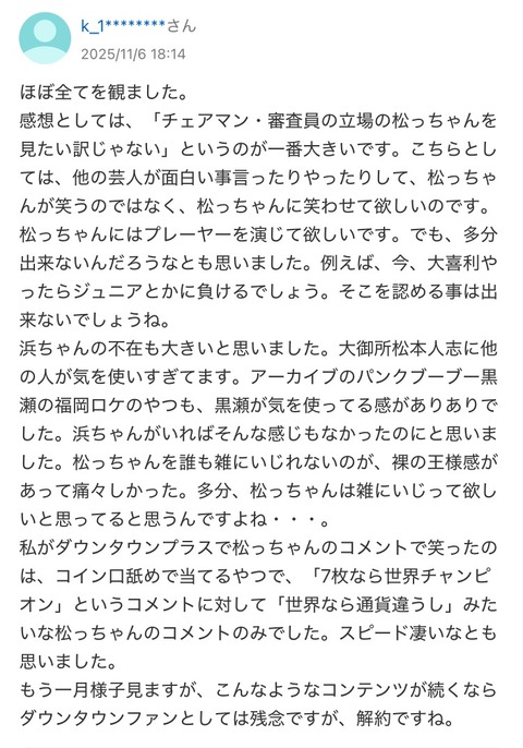 ほぼ全てを観ました。 感想としては、「チェアマン・審査員の立場の松っちゃんを見たい訳じゃない」というのが一番大きいです。こちらとしては、他の芸人が面白い事言ったりやったりして、松っちゃんが笑うのではなく、松っちゃんに笑わせて欲しいのです。松っちゃんにはプレーヤーを演じて欲しいです。でも、多分出来ないんだろうなとも思いました。 例えば、今、大喜利やったらジュニアとかに負けるでしょう。そこを認める事は出来ないでしょうね。 浜ちゃんの不在も大きいと思いました。大御所松本人志に他の人が気を使いすぎてます。アーカイブのパンクブーブー黒瀬の福岡ロケのやつも、黒瀬が気を使ってる感がありありでした。浜ちゃんがいればそんな感じもなかったのにと思いました。松っちゃんを誰も雑にいじれないのが、裸の王様感があって痛々しかった。多分、松っちゃんは雑にいじって欲しいと思ってると思うんですよね・・・。 私がダウンタウンプラスで松っちゃんのコメントで笑ったのは、コイン口舐めで当てるやつで、「7枚なら世界チャンピオン」というコメントに対して「世界なら通貨違うし」みたいな松っちゃんのコメントのみでした。スピード凄いなとも思いました。 もう一月様子見ますが、こんなようなコンテンツが続くならダウンタウンファンとしては残念ですが、解約ですね。