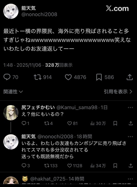 1:以下、?ちゃんねるからVIPがお送りします:2025/11/07(金) 16:52:54.876 ID:FZ2cdR6G0.net2:以下、?ちゃんねるからVIPがお送りします:2025/11/07(金) 16:53:33.011 ID:2aS5CCVP0.net ゴミの掃除ご苦労さまです! 3:以下、?ちゃんねるからVIPがお送りします:2025/11/07(金) 16:53:36.233 ID:inrhD2tC0.net汚物を引き取ってくれるなんて優しい外人もいるんだな 2ch2chblognews2ch
