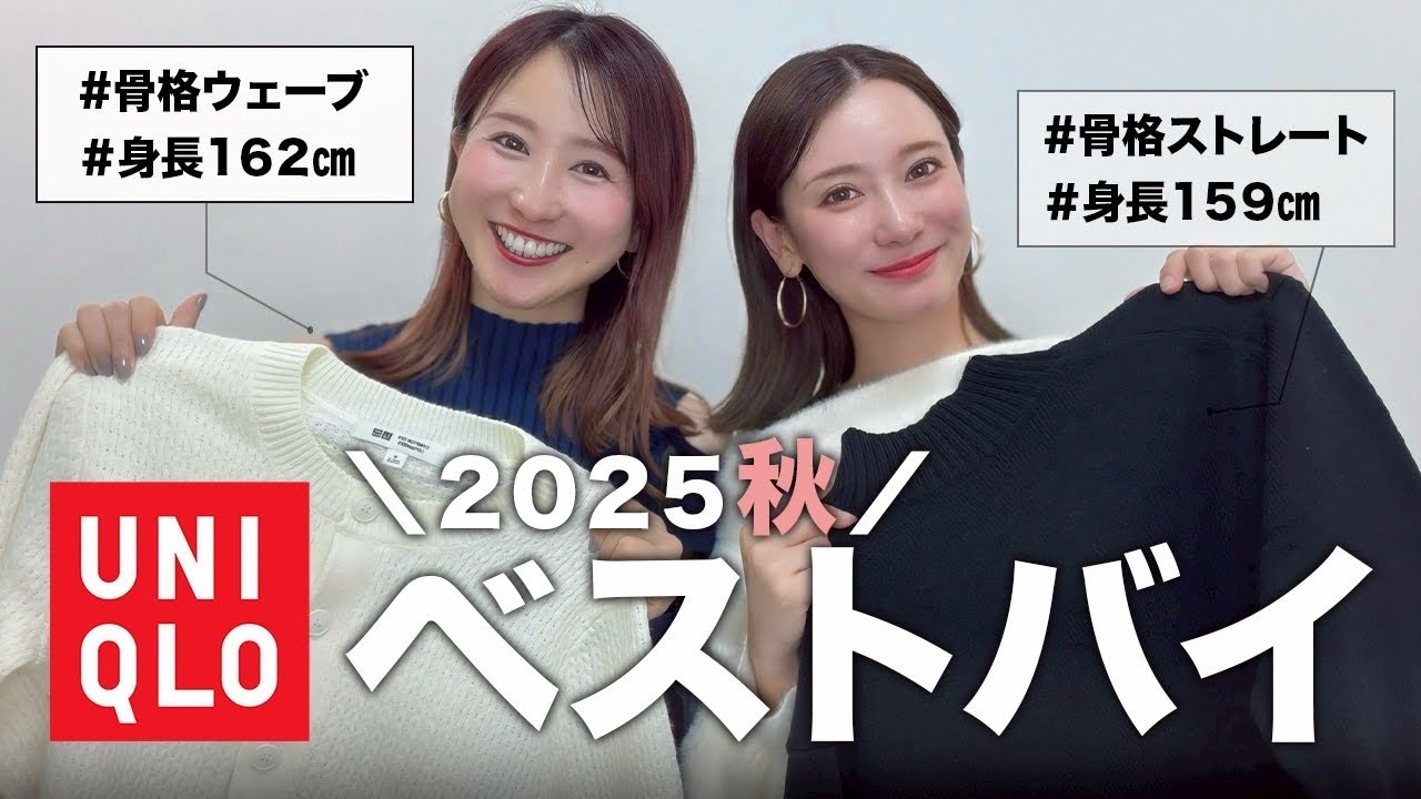 1 個は絶対に持っておきましょう。冬の必需品だよね。明的な出会いだった。全国格の方が足が長く見えるニムです。皆さんこんにちは。日本中を可愛いかっこいい人で見つしたいマイト よこです。 今回は2025 年この冬で買ってよかったベスト 5。 このチャンネルは診断実績1万5000 名様以上のウルパーソナルから獲診断サロンが違反を通してもっと魅力的になるヒントを届けするチャンネルです。 急に寒くなって何を買えばいいかわかんなくなってきたよね。明るい。もう何着ていいのか本当に困ってる。ユニクロに行ってみるんですけど、アイテムが多すぎてどれを買えばいいのかっていうのが毎回難しい。欲しいアイテムがいっぱい ある。最近はもうメ商品も気になってるので見れるものが増えて より迷ってるね。 今回はそんな皆さんに向けてこれさえ買えば間違いないという冬の万能アイテムトップ 5をご紹介していきたいと思います。 どれも気回し力抜群で今年っぽく見えるポイントも解説しながらコーデを組んでいきます。 それでは本編スタート。 今からユニクロで買って良かったベスト 5を紹介していきます。まず第 5 位。こちらです。ユニクロウールブレンドクルーネックカーディガン 01オフホワイトのM サイズです。これめっちゃ可愛かったんですよ。可愛かった。 このカーディガンの可愛いポイントはポコポコしたアみ目です。 このポコポコがあることでただのガーディアンがめっちゃ可愛く見えると思います。 ユニクロってさ、可愛いものが少ないから。 そうだよね。 珍しいよ、これ ねえ。色もアイボリって可愛いよね。 うん。可愛くなりすぎちゃうなっていう方はネイビーもすごくおすすめです。私はネイビーが欲しかった。な んでじゃあそれにしたの? こっちのが似合ったからネイビ似合わないって言われました。 似合わなかったよ。 でも着たいんだよ。似合わないけど来たい時あるよね。 うん。ある。でも買うに至なかったじゃん。 そう。 皆さん物が欲しかったのでこっちにしてます。アイボリーなので家べの私は顔釣りも良くってテンションがめっちゃ上がります。続きまして第 4 位じゃーん。ユニクロのタックワイドパンツです。 私が言うんじゃない。 あ、名前さすがに覚えてるでしょ。じゃ、サイズ言ってよ。 00番のホワイト サイズはS サイズです。タックアイドパンツは私お気に入りすぎて 4本買いました。 こないだ捨てたんでしょ? もうすでに2回捨ててるよ。 うん。タクワイド パンツの白は実は春夏しか出ない色なんですよ。今は売ってないけどやっぱりこの形は変わらないじゃん。 やっぱ使いやすいなって思います。パンツって体に沿いすぎないからお尻のラインが気になりにくいし太も気にならないし位置もちょっと高いので足が長く見えるんだよね。 うん。ジェンタープレスが入ってるのも嬉しい。 そうなんだよ。だからハンガーの書き方はね、センタープレスで追ってかけるっていうのがめっちゃポイント。 うん。 これはもう定番中の定番なので 1個は絶対に持っておきましょう。 第3 位。こちらお揃いメリノリブタートルネックセーターです。 2人ともMサイズを着てます。 これはもう絶対あった方がいいし持ってるんじゃない? 持ってる人多いと思う。 ユニクロに行ってこれ持ってない人っているのかな? たまに。 たまに。これは冬の必需品だよね。 必需品。何でも合わせやすいし持ちするよね。 うん。1 年ぐらい全然晩来ても大丈夫。 そう。1年ぐらい切れる。 え、だって3000 円で何回も何回も来て洗濯も楽だしまいやろ。 首が詰まってるのであったかい。 うん。うん。うん。 冷えちゃうか。 冷えちゃう。冷えちゃう。サイズが重要だよね。 うん。 これはあんまり小さいサイズを買うとムチムチして見えちゃうのでサイズはいつもよりワンサイズ上げるか試着するのがおすすめです。 これは本当に最高。みんなあった方がいいと思います。 2色あってもいいよね。 そうだね。 私も2色か3色持ってるよ。 うん。 私でも黒ばっかり甘いわね。好みです。 続きまして第2 位。これは意外なやつだよ。 ローゲージハイネックセーターサイズは S サイズでこれメン子商品になります。ユニセックス。 ユニセックス になりますね。これは本当にね、運命的な出会いだった。 私も欲しい。 あらゆるおすすめポイントが詰まっていて、まずシンプルな黒なんですけど、この首のところがね、リブっていうのがいいよね。で、苦しくない、詰まりすぎないっていうのもすごくいい。 ドロップショルダーになってて結構ねしっかり肩が落ちてるので肩幅がね、広く見えないんだよね。キシャ見えします。お袖のところにイリブが入ったり、お裾にもリブが入ってるんですけどおまりすぎてないからすごくね、タポっと可愛く着ることができます。 カとお揃いコーデできた。 あ、できる。これを専用で使うこともできるかもしれない。 確かに 旦那様とか彼氏とかこれは本当にもうみん