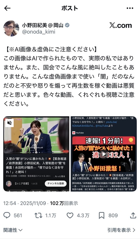 【※AI画像&虚偽にご注意ください】 この画像はAIで作られたもので、実際の私ではありません。また、国会でこんな風に絶叫したこともありません。こんな虚偽画像まで使い「闇」だのなんだのと不安や怒りを煽って再生数を稼ぐ動画は悪質だと思います。色々な動画、くれぐれも視聴ご注意ください。 https://x.com/onoda_kimi/status/1987368066100163010