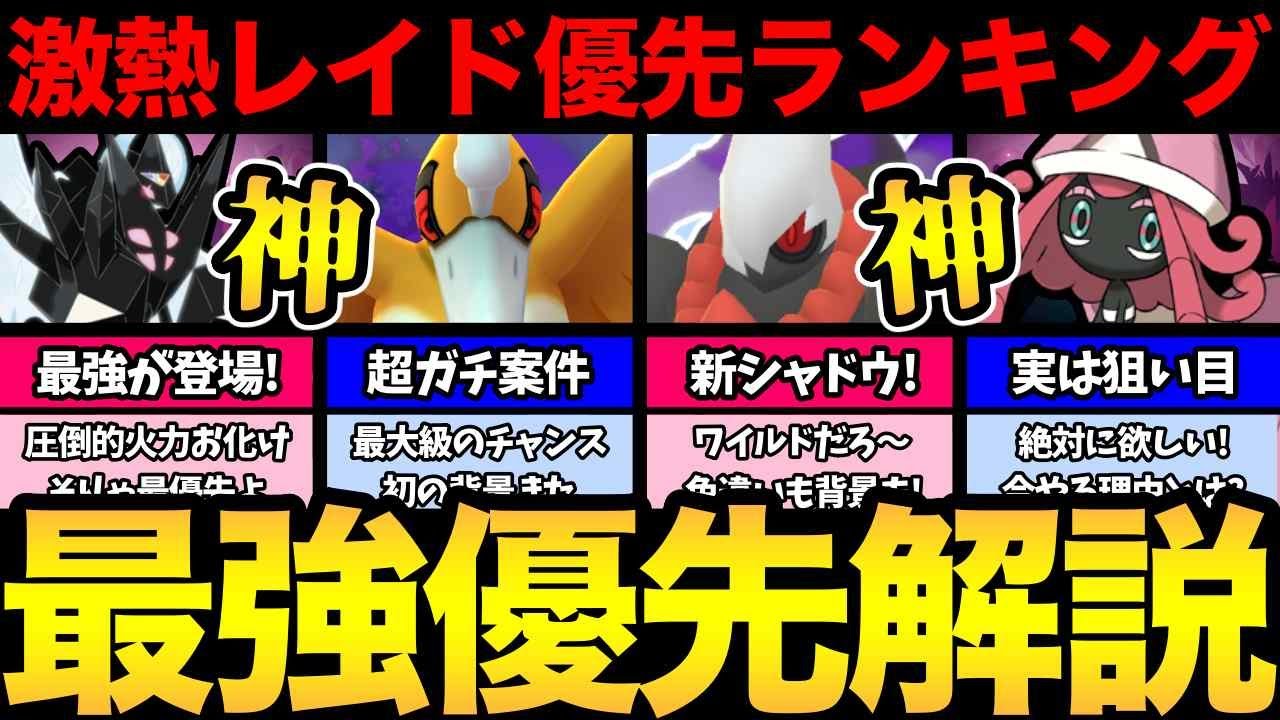 皆様どうもコペリゴです。今回はレイド 優先ランキングやっていこうと思います。 というのも明日10日月曜日からは ワールドウィークが始まりまして日張わり レードが開始。さらに毎日レイドアワーが あります。そして週末土曜日日曜日は ワイルドエリア本場なりましてシャドウ クレスエリアシャドウダークライが登場。 またその他にも注目レイドがあります。 そういった感じでありまして明日から たくさんレイドが登場しますのでどの レイドを優先してればいいか話していこう と思います。でですね、独断と偏見では ありますが、ま、レイド視点、GBL視点 、またね、ま、色違いとか背景といった コレクション要素も加しながらランキング をね、作りましたので見ていきましょう。 あくまで個人の意見ではありますので参考 程度にお願いします。あ、ちなみにもっと 枠を広げてそのね、課金の優先ランキング というね、話をしていきますと、あの、 もう明日から始まるゴーパス ワールドウークの、え、銀のおがね、圧倒 的1位ではありますので、え、そこは一応 お伝えしておきます。 はい。それではまずは16位から9位で ありまして、じゃね、こちらに関しまして はその優先度低めと言いますか、ま、そこ までね、え、熱くないよみたいな感じで、 え、ざっくりね、まとめて話をしていき ますと。は、でですね、まず1体目が16 位のコバルオンでありますが、ま、この子 はですね、ま、一応ハイパーリーグで、ま 、強いポケモンではあるんですけど、え、 正直ですね、最近はあまり使われており ませんので、まあ、うん、今回特に課金し てやるって感じじゃないかなとは、はい、 思っております。はい。ですね、続きまし てが、え、15位ですね。こちらカプ レヒルになりますが、ま、これね、カップ レヒルもね、似た感じでスーパーハイパー で活躍時はあるポケモンなんですけど、ま 、最近はね、もうほとんど使われていませ んので、まあね、特に今回頑張ろうって いう風な感じでは、ま、実用面としては ないかなとは思っておりますね。ただね、 え、今回そのカプレヒレ登場時には背景が つく可能性がありますので、ま、カップ レフィリが好きとか、ま、背景自体をね、 コンプした方に関しましては、え、狙って いくのもいいかもしれません。はい、続き まして順位はカプコ記後でありまして、 以上ですね、この子に関しましては、あの 、今シーズンね、ボルチェンの許可が入っ ておりますので、え、少しね、あの、 ハイパーで、ま、強いとは言われ始めては いるんですけど、ま、そこまで、ま、 もちろん強くないけど、ちょっとね、え、 面白いと言われ始めてはおりますね。また ですね、背景がつく可能性もありますので 、ま、GBL厳選しながら背景狙っていく ぐらいの温度感でしょうか。続きまして 13位はカプテデフでありまして、一応ね 、このね、カプテデテデフはマスター リーグで活躍した時期はあるんですよね。 ま、最近は特にあれかな、ザシアン来て からはあまり使われていませんが、一応 勝着時期はあるポケモンですので、ま、 100%とか狙ってみてもいいかもしれ ませんし、あとですね、もう1点言って おきたいのが今回ね、ま、優先度低めでは あるんですけど、この子ね、ま、ピンクっ ぽい、ま、体してますので多分ね、この、 えっと、ワールデアの背景がめっちゃ 似合うと思うんですよ。ま、そういった ことも加していくと、ま、もう少し優先の 高めてみてもいいかもしれません。はい、 続きまして12位はシャドラティオスで ありますね。え、このね、ま、シャド ラティスに関しましては、ま、以前からね 、お伝えした通りシャドウ色違いが新ドに なっていますので、結構ね、暑いには暑い んですけど、ただね、あの、ま、今月多分 いっぱいいっぱい、あの、情説と言います か、ずっと出ずっ張り、ま、ワールデリア 期間は出ないとは思いますけど、ま、 そんな感じなので、ま、そこら辺ね、その 登場期間が長いってことも加すると、ま、 優先度というか課金する必要はないかなと いった、え、ところでしょうか。続きまし て11位はビリジオでありまして、このね ビリジオンはハイパーリーグの採用上位の ポケモンですね。確かね、今シーズンも 採用トップ10には入っておりますので、 ま、本当にね、ずっとずっと長く ハイパーリーグで活躍している、え、ガチ ポケでありますので、ま、レドやってって ね、その交換用のね、個体格好したりとか 、あとね、レイドさんでも十分強いので、 レドさんをね、え、確保してって、ま、 厳選していくのもいいかなと思います。 続きまして、10位はカプルでありまして 、ま、これね、カプルは一時期マスターで 結構ね、使われてたポケモンなんですよね 。ま、当時のパルキアダイモンじゃなかっ たから、ま、使われてなかったので、え、 パルキアカ封ポケモンとしてかなり使われ てた、え、ポケモンではあって、ま、最