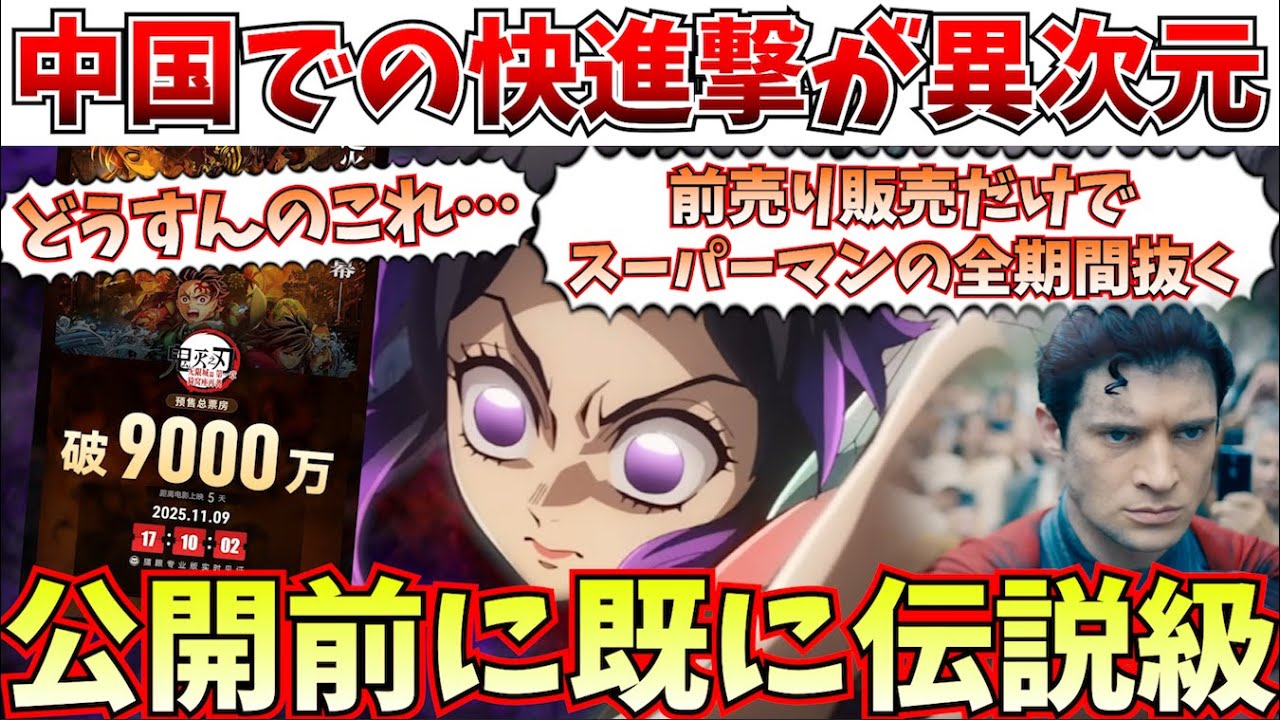 分離主義勢力の諸君ご機嫌よ。行かれた 動画にようこそ。ここは地獄だ。さて、 今回の日産はだな。鬼滅の刃無限上編の 中国でのチケット販売が異次元の事態と 愛なっているため、これについてこのIQ 3.2兆のこの俺様が語り散らかして いこうと思うぞ。お前ら耳の穴かぽじれ。 一体全体何がどうなっているのかというと だな。まず始めにだ。中国での公開が決定 し散らかした鬼滅の刃。前売りチケットの 販売数が異次元なことになりそうだという 話は以前もしたよな。それがここ数日で さらに異次元の事態と愛なったので今回は それについて掘っていこうというコーナー だ。先に前置きしておくのだが、まだ公開 まで4日程度ある。つまり、まだまだ 前売り販売の数字は発展途上ということだ 。つまりこれから発表する異次元の数字と いうのは最終到達地点ではなく単なる通過 点に過ぎないということは留意しておいて 欲しい。つまり、まだまださらなる ステージへと鬼滅の刃は向かっていくと いうことだな。ちなみにだ、中国以外での 主要な国々ではすでに公開済みとなって いる。ある程度の伸び代は完全に見えて いる状態だ。ま、つまり今から核変みたい なものは起きずにある程度ここに着地する だろうというのは他の国に関してはもう ほぼほぼ分かりきっている状態だ。全世界 累計の成績ではおそらく中国抜きで 7億ドル程度だろう。ちなみに台湾では 特に化けモ級と言える数字を叩き出してい て、これまで公開してきた歴代映画の中で 3番目の売上を叩き出している。この3番 目の売上というのは、あ、もう歴代映画 っていうのは、つまりは今までの歴史上 公開してきた全ての映画の中で3番目と いうことだ。うん。とんでもないことだよ な。1位アバター、2位エンドゲーム、 そして3位が鬼滅の刃という状態だ。 分かるか?アバターエンドゲームに継ぐ3 番目のヒットタイトルが鬼滅の刃。台湾で はこのようになっているというわけだ。 マジで快墟としか言いよがないだろう。 その他の韓国などでも大きく同員している ことは今更説明するまでもないよな。韓国 はチェンソーマンといい、8番出口といい 、今年なかなか日本映画が元気な年って 印象があるよなあ。 そしてうん、いろんな国で大ヒットを掲げ ている鬼滅の刃なわけだが、最後は中国で ド派手な花火を打ち上げようという寸法だ 。もはやアニメは世界のメインストリーム でアメリカなのでも大きな収益を叩き出し ているということは言わずもだ。うん、 そうだ。もはや世界中の人が当たり前に アニメを見ている。しかしその上でだ。 アジア県での指示は特に暑いわな。うん。 ま、政治的には色々な問題を抱えているの は理解するし、俺の中で思うことは色々 あったりもするわけだが、それはそれとし て文化交流は、ま、是非ともね、健全に 広がっていって欲しいという思いはある。 ま、そういうわけで中国での前売りの話だ 。 前売りチケット。中国での前売りチケット 販売開始から数日が経過した。すでに チケットの売上は9000万に迫っている 状態だ。早ければ月曜日中に1億に到達 するのではないかと思われている。小学的 な前売り販売を受けて前売りだけで1億円 稼ぐんじゃないかと、ま、当初言われてい たわけだ。うん。ま、それこそ前売り開始 。1日目とかかな。1日目ぐらいの時は 最終的に1億限ぐらい行くんじゃないかと 言われていたんだよな。ただぶっちゃけた 話をするともう今の時点で9000万円 近く数字を伸ばしているわけだからな。 はっきり言って1億元というのはもはや 通過点になってしまったというのが正直な ところだろう。ちなみに1億円というのが 具体的にいくらぐらいなのかと言うと、ま 、日本で言うところの21億円、あ、 米ドルで1380万ドルぐらいって感じだ な。ま、これが通貨点に過ぎないほどの 前売上を現在記録中というわけだ。すに ドルカ算で1000万ドルを超えている 狂器の有様だ。分かるか?これ本公開後の 数字じゃないぞ。前売り販売の数字だぞ。 しかも前売り販売のまだ中盤ぐらいの時点 での数字だからな。本当に意味がわから ない。ちなみにコロナ禍以降最も高い 前売り販売を誇るタイトルはアバター2と されている。アバター2は映画にその名前 を刻むレベルの革命ヒット映画だ。全世界 で23億ドル稼ぎ出していて2ですら相手 にならないほどだ。中国で最終的に アバター2は2.4億ドルほど稼ぎ出して いる。そのアバター2の前売り販売をまあ 超えるだろうといった具合だ。ちなみに現 時点でどれだけこの数字が凄まじいのかと 言うと、スーパーマンと ファンタスティック4をすでに超えて しまっている。まだ前売り販売開始から 中盤であるにも関わらずスーパーマン ファンタスティック4というアメコみ映画 を超えてしまっているわけだ。おっと、 ここで言う超えているっていうのはあの 前売りの売上を超えているっていう話では ないっていうことは一応言っておく。何を 超えてる