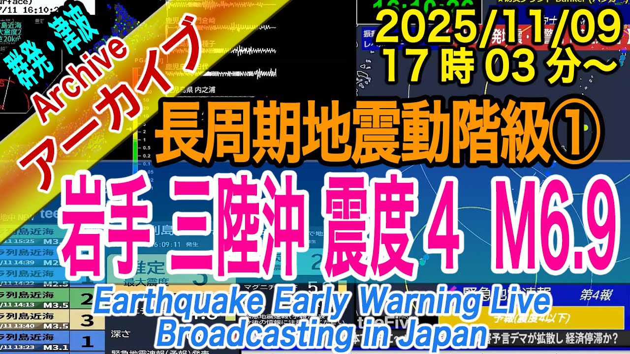【群発化・予測監視中】岩手県・三陸沖 最大震度4 M6.9 長周期地震動階級【1】2025/11/09(17:03)念のため 大地震・大津波に備えを