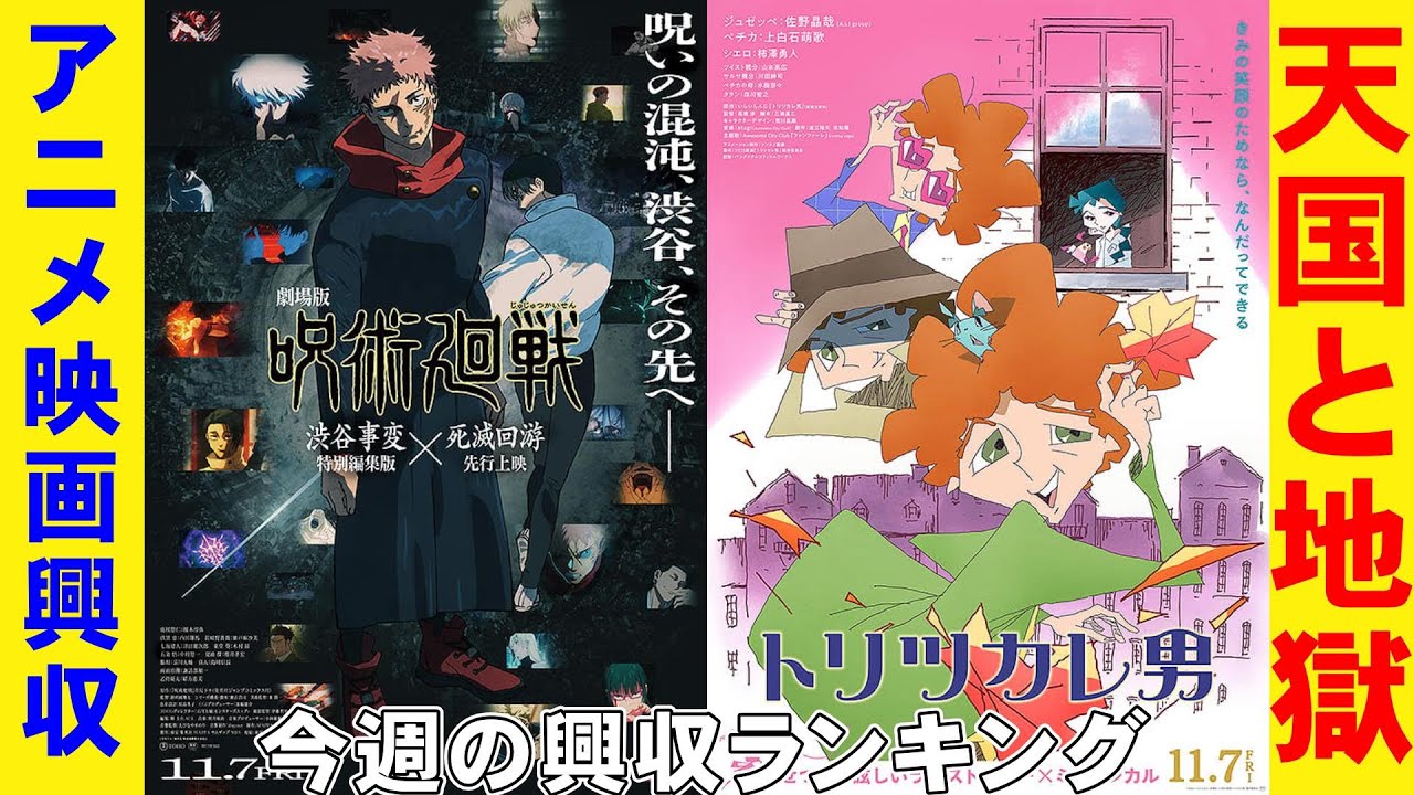 どうも皆さんこんにちは。ミステリー作家 の七尾よしです。はい、俺的映画速報第 346回、え、第1部ですね。俺的映画 速報第1部では今週の映画工業収入同員数 ランキングを、え、見ながらトレンドの トレンドについて、映画のトレンドについ て語っていきたいと思います。ということ ではい。え、今回はね、え、今日は、え、 第1部、明日木曜日第2部ですね。第2部 は、え、今週金曜日からスタートする、 公開スタートする新作映画全部を紹介して 、あと映画にまつわるニュースを、え、 いくつか皆さんにお届けしたいと思って おりますので、え、明日の俺デ映画速報第 2部の方も皆さん是非チェックのほど よろしくお願いします。ということで、 はい、今日はね、第1部ですね、え、国内 映画ランキングということで、こちらね、 え、工業収入というか、え、同員数ですね 、ド員数集計のランキングになっており ますということで、はい、え、今週はね、 新作が上位に食い込んで結構ね、上位、 えー、上位がかなりね、入れ替わっており ます。えっと、新作がアンド 3ということではい。えー、新作がね、え 、3作入っております。ということで上位 がね、かなり大きく入れ替わりましたと いうことで、はい。え、第1位こちらです ね。劇場版呪術回戦、え、渋谷自編特別 編集版と、え、使滅海遊先行上Aという ことになっております。はい。こちらです ね、東報ですね。初日から3日間で同員 41万7700 人、講衆6億4000万円 を上げて労働の初登場1位に輝きました。 ということではい。またね大型コンテンツ 大型アニメが来ましたね。え、こちら呪術 回戦。え、劇場版第1作目もね、え、歴代 ランキングに乗るほどに大ヒットをしまし た。後でまた歴代ランキングね、チェック していますけども、え、こちらはですね、 えっと、アニメ第2期の後半と来年1月 放送となる第3期の1話と2話を上映する という先行上映ですね。これあの鬼滅の 映画もやってましたよね。えっと、アニメ 第2期の後編と後半と後半後半っていうの はどういうことですかね。で、1話と2話 。え、鬼滅のエヴァはね、え、次回新しい 第次の期の、え、1話だけでしたけど、 こちらはオーバンブル舞1話と2話を先行 上映するということですね。いやあ、カね 、あの、このビジネスモデル、やはり大 ヒットドラね、大ヒットアニメの今後の ビジネスモデル、スタンダードなビジネス モデルになってきそうですよね。まあでも やっぱり工業収入100億とか200億を 上げるような、え、アニメではないと なかなかこれはねできないんじゃないかな と思うけど、やっぱり鬼滅のば事術回線と もなるとこういうことができちゃうわけ ですね。いや、もう1つで2度し、本来 これテレビ版ですからね。テレビ放送版 ですから。それを何作か、え、何話かけ 集めて編集してで、こういう形でね、もう 初集3日間で6億円も稼いちゃうっていう ね、新しく別にこの劇場、この映画のため に新しく書き下ろしたわけでもないのに、 もうチャオの立場どうなっちゃうのってね 。 あとなんか今週そういえばさ、取り憑かれ 男だかっていうのやってませんでした。 アニメでね、代々的にやってたと思うん ですけど。ランキング入ってましたか? はい、どうでしょう?ということで、え、 事術回戦が、え、今週ね、1位、ま、これ はもう1位取ることはね、予想していた ことだと思うんですけど、やっぱり強い ですね、少年ジャンプ。え、僕はね、柔術 回線あんまり好きじゃないんで見ないん ですけども、あれ劇場版だけね、前回見 ましたけどうーん、あんまり面白いと思わ なかったんですね、あれはね。ま、鬼滅バ ね、面白いから見続けてはいるんですけど も。はい。ということで、えっと、これ どうなるんですかね?これ劇場版とはつい ているけども結局のところこれテレビ放送 版ですよね、これ。そういうことじゃない ?うん。そうだよね。だからまた新たに あれですかね、あの鬼滅の映刃のように また劇場版、純粋な劇場版が挟まれていく みたいな。で、テレビ版と、え、劇場版を 、ま、テレビ版がずっと放映されてる第期 、第2期、第3期の中やってく中で、え、 途中また劇場版が挟まれていくみたいな 鬼滅の刃方式でやってくんですかね。はい 。というわけで、もうね、え、初集だけで 6億4000万円も稼いでいるということ で、いや、もうなんかね、こうなると本当 新作アニメとか新作映画作るのがバカバカ なっちゃいますよね。はい。も新作なんて 作んなくて良くないですかってね。はい。 ということで、え、第2位がね、もう爆死 しても良くないですかっていうね、爆弾 ですね。え、前週こね、え、前回これ2位 だったんですよね。えっと、前回は2位 でしたっけね、これ。 そうだね。前回2位だったんですよね。で 、前回1位がチェンソーマンだったんです よね。で、チェンソマンがボンと打ち込ん で、え、爆弾が生き残って るっていうことで、爆弾結構すごい