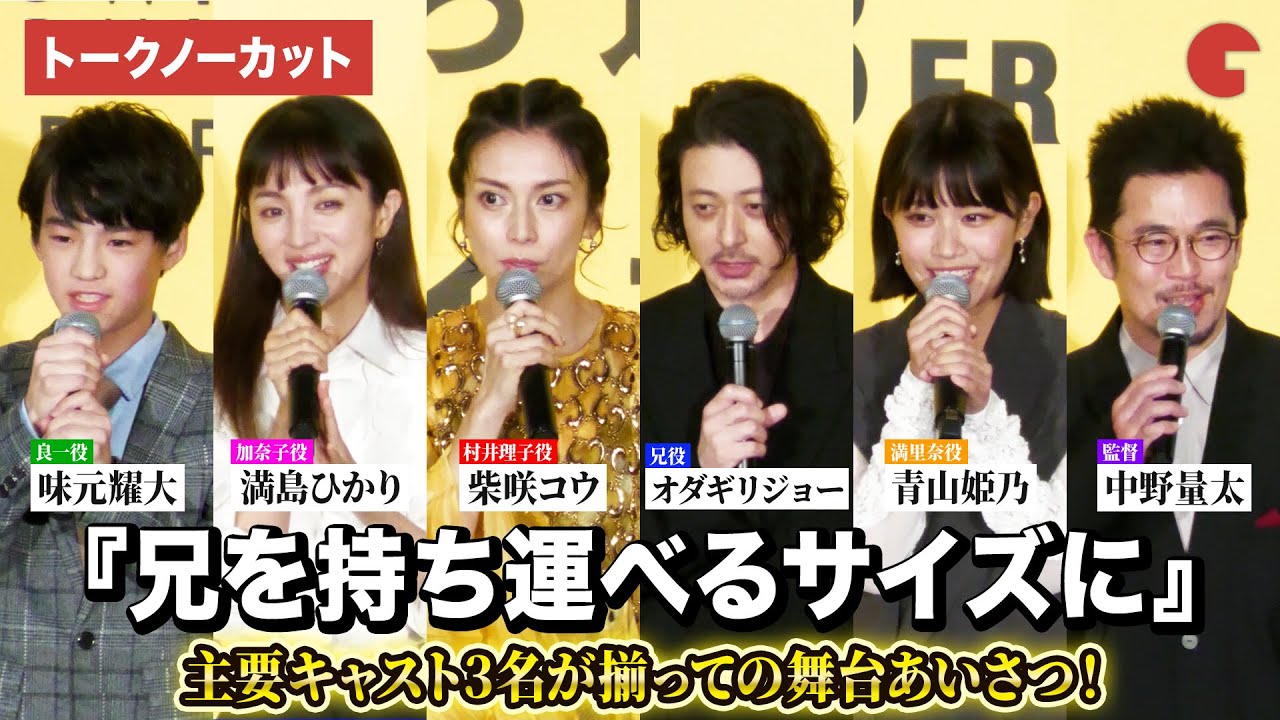 さあ、ではまずはご紹介をさせていただきますのでご挨拶をそれぞれいただきたいと思います。最初にマイペースで自分勝手な兄に幼い頃から振り回されてきた主人公の利子を演じられました。柴崎子さんお願いいたします。 皆さんこんばんは。柴崎子です。本日は 11月28 日の、え、映画公開に先がけて皆さんにこの世に、え、先行してこの映画を見ていただけること嬉しく思っております。 それと同じぐらい本日さん参加してくださって 嬉しいです。あのね、割と 3 ヶ月ぐらい前から結構色々プロモーションというかね、この映画をどうやったらあの楽しんでみてもらえるかっていう風に監督とひかりちゃんとあと 2 人もそうですけど舞台挨拶はね一緒にやってたんですけどずっといなかったんですよね。おさん。 うん。なんかね、呼ばれてなかったです。 いやいやいやいや忙しかったんですよ。 なんか呼びにくい理由があったんだと思います。 あ、あのね、あの、ご自身の作品でね、え、ということで本当にあの、私も、えっと、久しぶりに小田桐さんと共演させていただいて、またこういう風に一緒に登壇できること嬉しく思っております。ありがとうございます。 ありがとうございます。そしていい加減で嘘ばかりつき家族を振り回して北兄を演じられた小田桐城さん改めてご挨拶をお願いします。 [拍手] あれなんか今のもうそのように聞こえますよね。言い訳も。 えっと、いや、ようやくこうやって参加できて本当に嬉しく思ってますが、あの、なんか僕がいない時はそのプレートを持ってたじゃないですか、みんなで。 はい。 あれはあれですごい可愛かったし、すごくいいなと思って見てました。ま、あの、ほぼほぼ今日初めての参加みたいなところで、あの、改めて頑張っていきたいと思います。え、短い時間ですがよろしくお願いします。 ありがとうございます。 皆さん本物ですからね。今日はパネルじゃないですからね。嬉しいと思います。さあ、そして、え、兄の元妻であり、ある理由で兄と離婚し、今は離れて暮らすか子を演じられました。三島ひさん、お願いします。 こんばんは。三島ひです。今日はよろしくお願いします。え、なんか今日すごいこの映画館かっこいいですね。 すごいこの私たちから見てる皆さんが すごいかっこよく今見えてて、あの兄を 持ち運べるサイズには中野さんの作品に初 参加で、えっと本当にあのあ、この役で 呼んでもらえるんだっていう嬉しさと台本 を読んで本当に台本が面白くってあの映画 を見た後もそうだったんですけど本当に 初見で台本読んだ時にめちゃくちゃ泣いて めちゃくちゃ笑ってすごい私の胸にがもう 来るものがいっぱいあって、それであの 共演に柴崎孝さんがいて、小田桐城さんが いて、子供たちがいてっていうのですごく あの現場も自然に楽しくさせていただき ました。個人的に大好きな柴崎さんの表情 のカットと織田桐さんのめっちゃ最高な アップのショットがこの映画にはあって すごく見所だなと思っています。 今日はよろしくお願いします。 お願いします。ありがとうございます。続いて兄とかな子の娘で両親の離婚後は母と暮らすマリナを演じられました。青大山姫野さんお願いします。えっとマリナ行を演じさせていただきました青山姫野です。と今日はあの会場に来てくださってありがとうございますと [拍手] 2 回目なんですけれども緊張しておりますのでよろしくお願いします。 お願いします。続いて 2人のもう1 人の子供で最後まで兄と暮らした息子領一を演じられました本洋太さんです。お願いします。はい、こんばんは。 こんばんは。 え、領一役を演示させていただきました本洋太です。え、今日は皆様の貴重なお時間を使って見に来てくださって本当にありがとうございます。え、本日はよろしくお願いします。 お願いします。 ありがとうございます。そして本作が [拍手] 5 年ぶりの新作です。中野良監督です。お願いします。はい。え、監督、監督を務めました中野良り太です。あの、監督なんてこう現場を離れちゃうともう本当にね、もうただの人なので、今こう眺めてて、あ、このメンバーでそういえば映画去年取ったなっていう感じを考え深く感じております。 あの、作品自体はとても自信のある作品に仕上がってますので、この後遠くの後楽しんでみてだければ嬉しいです。よろしくお願いします。 よろしくお願いします。では、マスコミの皆様、ここからのフラッシュ撮影は [拍手] 1度みたくようお願いいたします。 今監督も去年取っていたという話をされていましたけれども、昨年の撮影を経て公開まで約 2 週間となりましたが、柴崎さんこうやってお客さん目の前にされて今のお気持ちはいかがでしょうか ね。監督も常々おっしゃってますけど、 あの、公開されたらそれは1人1人お客 さんのものにこの作品はな るっていうところで、その今一歩手前まで 来てるんだなって思うと早く公開されて 