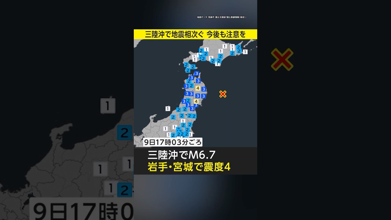 三陸沖で地震が相ついでいます。今後も 揺れに注意が必要です。三陸沖きでは 土曜日から地震が相ついでいて、9日曜日 の朝からはマグニチュード5クラスの地震 が相ついています。夕方には マグニチュード6.7の大きな地震が発生 し、最大震度4を観測しました。また津波 も観測しています。この地震は千島開光、 日本開光の巨大地震の想定駅内で発生し ました。今後も地震が発生する恐れがあり ます。もしマグニチュード7.0以上の 地震が発生した場合は初めて北海道三陸期 高発地震注意情報が発表されることになり