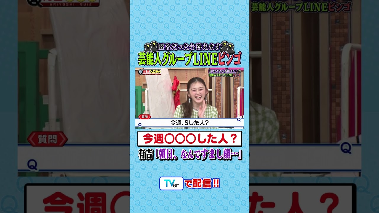 Share Facebook Twitter Pinterest LinkedIn 匿名だったら答えます。芸能人グループLINEビンゴ📱 #有吉クイズ #有吉弘行 #shorts 匿名だったら答えます⭕️ 芸能人グループLINEビンゴ📱 https://tver.jp/series/srje90cvfz Q.今週〇〇〇した人は? 朝日、なんですまし顔…⁉️ #有吉クイズ #有吉弘行 #アインシュタイン河井 #みなみかわ #柏木由紀 #朝日奈央 #さらば東ブクロ #霜降りせいや #納言薄幸 #えなこ #ゆうちゃみ celebrity吉木りさ
