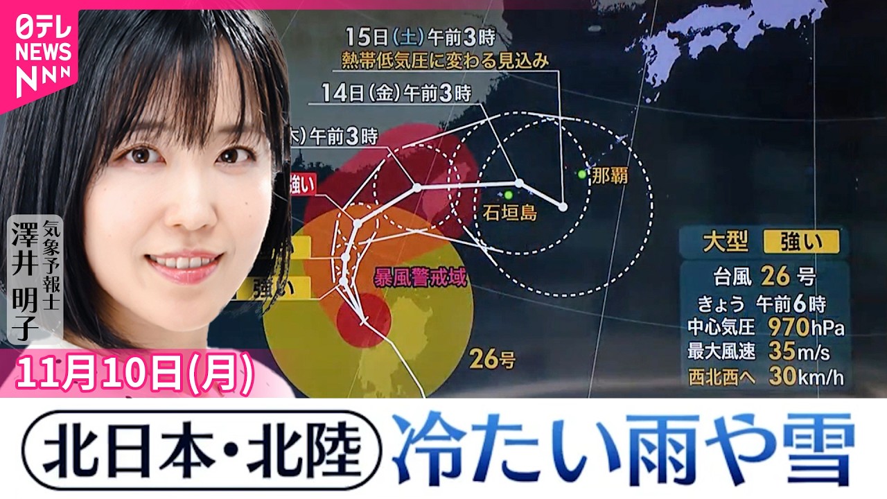 こちらは東京スカイツリーからの今朝の空 の様子です。だんだんと雲が取れて青空が 広がってきました。え、今日は朝よりも夜 の方が寒くなりそうですので服装を選びお 気をつけください。ポイントこちらです。 え、換気が流れ込むことで北日本や北陸で は冷たい雨や雪が降るでしょう。その他 晴れるところも次第に冷たい空気に変わっ ていきそうです。ではまず予想点から見て いきましょう。え、日本付近は今夜にかけ て成功統定冬の気圧配置に変わってくる 見込みです。日本付近は島模様の討圧線に なることで全国的に北寄りの風が強まり そうです。また上空には強い換気が 流れ込むことで日本海岸側を中心に雨や雪 が降るでしょう。では天気の映り変わりで 詳しく見ていきます。え、今日の昼前、 西日本や太平洋側では晴れるところが多い ですが、北陸から北の日本海側では冷たい 雨が降って北海道は雪の降るところもある でしょう。え、そして昼過ぎになると 北海道は平地も含め多くのところで雪や みぞれに変わっていきそうです。また東北 や北陸、待機の状態が不安定で落雷や トップにも注意が必要です。そして関東 基本的には晴れるんですが、一部でパラっ とに雨があるかもしれません。え、そして 夜にかけては、え、東北、北部でも雪に 変わるところがあるでしょう。また晴れる ところでも夜にかけてぐっと気温が下がっ てきますので、え、風を通しにくい、 温かい上着があると良さそうです。では、 おしまいに台風情報です。 え、台風26号は今週の木曜日から金曜日 頃にかけて沖縄初島に接近する予想です。 で、そ、その頃には勢力を落としてくる 予想ですが、え、今週沖縄付近には前線が 停滞する見込みで台風と前線の相互作用で 、え、長い時間の大雨になる恐れがあり ます。また会場は大敷となりそうですので 十分注意が必要です。 では全国の今日の予報です。 北陸から来たの日本海側で冷たい雨が降り 北海道は次第に雪に変わるでしょう。関東 から九州は晴れますが北風が冷たく感じ られそうです。予想最高気温です。次第に 北風が強まって朝より夜の方が寒くなる ところが多いでしょう。東京は20°まで 上がりますが夜は10°近くまで冷え込む 予想です。週間予報大阪からナ覇です。 晴れる日が多いですが、木曜日は太平洋側 を中心に雨が降る見込みです。朝晩と昼間 の大きな感にお気をつけください。札幌 から名古屋です。北日本や北陸は明日に かけて雨や雪が降り、その後は晴の日と雨 の日が交互にやってきそうです。関東や 東海は晴れる日が多く洗濯日になる でしょう。非常情報でした。