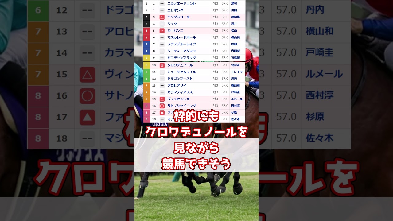 今回はさ木正一ムードやけど予想はどうなりそうなん? 今回はしゃあなね。本命はクロアジュノール。 やっぱりそうやんね。3戦3 勝の素晴らしい成績。全は乱れたペースにも気容に対応できた。前にも行けるし、最後の足も確実。負けるとすれば数で振りがあったりするだけちゃうかな。それもこの枠順なら大丈夫やと思うで。 不安材料を上げるとすれば感覚が空いてるけどどんな風に成長してるかやね。 [音楽] 北村ジョッキーがラジオで言ってたけど早い足があまりないと感じているらしい。 [音楽] 時計的には十分すぎるけどね。 そうやねん。切れ味もあるタイプやけどね。 そう感じないくらい普段から早いっていうことやと思うで。 ますます資格なしやな。他の水晶馬は まずは里のシャイニングトスポ牌は負けたけど目標になってしまう展開面の振りもあったしね。何より木さぎが素晴らしい競馬。やでの勝ち度系がめちゃくちゃ優秀。枠的にも黒ワズノールを見ながら競馬できそう。 他にも水晶馬はいる。3 連携にも加える意味でもう少し水晶馬を上げるわ。まずはファウストラーゼ。長くいい足を使えるタイプでやよい賞はお見事やったね。今回も 4 コーナーで黒はノールの前にいるやろね。どこまで前に行けるか差を広げられるか。 シフト太差が発揮さればいいとこまで 行けるんちゃうかな。それから貧選手しよ 。やよい昭和2着やけど走り慣れた中山 競馬場中山2000mの持ち時計が抜群や で。それからキングスコール新馬の後長く 休んだけどなんとか間に合ってスプリング ステークス3着。1度叩いた上昇は 大きそうやで。あと序盤にもホープフル ステークスがハイレベルだとするとそこで 2着のこの馬もハイレベルやね。1度使っ て上昇度はかなりありそう。馬券的には どうなりそう?黒ジュノールは硬いやろう からまず生まれん流し黒ノールから相手5 点。3連服は少し買い型を普風するわ。 黒ワを1 等軸に里のファウスト陰線が2列目。残り 2頭を加えた5等が3列目。 今回は軸に逆らったらあかん感じやね。 スター誕生の瞬間を見るレースやと思うで。 [音楽]