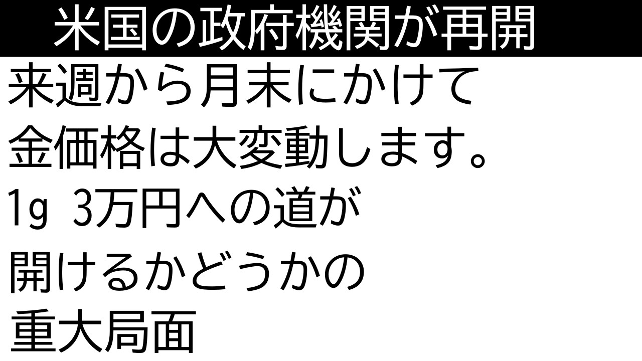 こんにちは。正です。来週から金価格の 変動が大きくなりそうです。とうとう今日 は等々民主党が合意して政府機関が再開し ます。日本時間で言うと明日です。明日 通るみたいです。それに伴って延期されて いた経済指標がどんどん出てきます。雇用 統計なんかの経済指標です。おそらく悪く なってるんじゃないかと思います。 おそらく金価格はこの悪化を折り込んで 4000ドルのレンジを抜けて 4100ドルまで上昇したんじゃないかと 思います。金にとっては政府機関が再開 することは良くないニュースです。しかし 上昇したわけです。だからある程度 折り込んでいるはずです。ですから予想 よりももっと悪いってなったらバンって 上昇するし予想よりも良かったってなっ たらバンって下がると思います。また 4000ドルまで下がってレンジってなる かもしれませんですからまだ安心はでき ません。今日の時点で言うと12月の FOMCで0.25% の利下げを68% 折り込んでます。しかしパウリ議長は 利下げはしませんよっていう方向なんです 。ですから68% っていうのは金融市場が過剰に折り込み すぎているとこです。ですから雇用統計 なんかがよっぽど悪くないと剥がれ落ち るってことです。50% 40%とか下がってしまうってことです。 そうすると利下げは厳しいってなります から金価格も下がります。今現在は 4120ドル ですけど、また4000ドルのレンジに 戻るとそうなってしまうと思います。 もちろん雇用統計がかなりやばいとそう なったらビヨーンって上昇します。 4380ドル の最高値を超えて4500ドル を目指すと思います。金のETFも調子が いいですからね。昨日はスパイダー ゴールドシェアETFが4t増えました。 もし雇用統計がかなり悪いってなったら ビヨンって増えると思います。投資需要を 中心で4500ドルを目指すと思います。 ちょっと心配なのが中国のジュエリー需要 です。消費税がかかるってなっちゃいまし たから需要が減ってしまうかもしれません 。ということで以上ですけど、今後出て くる雇用統計これに注目しましょう。2回 分出てきます。では以上です。ご視聴 ありがとうございました。