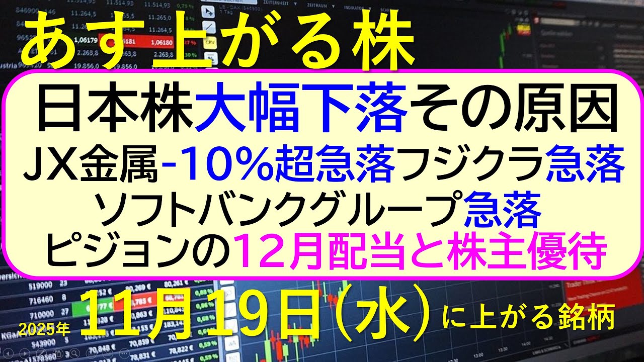 あす上がる株 2025年11月19日(水)に上がる銘柄。日本株下落の原因。JX金属10%超急落。フジクラ急落。ソフトバンクグループ急落。ピジョン配当。~最新の日本株情報。高配当株の株価やデイトレ情報~