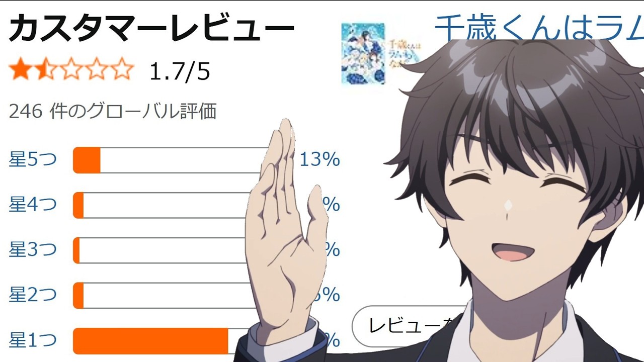 [音楽] 批判殺共官話題の問題作千歳君は ラムネビンの中ハージ回るよう4話で 一区切りつくようなのでそこまで見ます。 身内のりだけで笑いを取っている陽キな千歳君に教師から任務を言い渡される。 1 年の三岳から不投校になっている同級生の山崎を投稿させてほしい。 美しく生きられないのなら死んでいるのと大した違いはない というご立派な美学を持つ千歳君は引き受けることにしたのだったという感じです。いや、言うほど悪いか。これ芋座の方がよっぽどだと私は思いました。 あっちの方が完全に物語としてキャラ設定 として破綻してるんだもん。千歳君は うざい。これくらいしかなくそれはその人 の個性だと思えば矛盾してるようには見え ないしその人なりの行動をしていると思っ た。うざいけど言動や思考がマジでうざい けどポエミーで情緒溢れる文学表現が めちゃくちゃ鼻につくインテリき取り感が してかなりうざくて私はこれ以上見なくて いいかなとは思うけどそれは彼の個性とし て成立してるんじゃないかしら。ほぼ いきなり窓割って侵入してくるのはどうか と思うけどそれもしょうがない。それが 最善だと思ったんだから。それにしても窓 悪るなんてラフメイカーくらいしか知り ませんでしたが、こんなすぐに努力行師に 出るんですね。ラフメイカーは頑張って 頑張って抜け出そうとした結果、抜け出せ ないから助けてくれって流れだったのに ほぼいきなり惑わりか。まあそういった 文学表現が好きな人はいるんだろうけど私 的には嫌いとしか言いようがない。これは ライトノベルじゃん。ライト差がないん ですよ。なお内容はしっかりライトノベル 。千歳君の喋りや心情もそうなのですが、 ちょいちょい字の分として表現されるはず の毒白が非常にポエミーで正直すごく うざく感じる。その部分も千歳君ボイスで 喋るからなんで君その場面でそんなポエム 言い出してるのと思って気持ち悪いです。 1話目のキャラの説明もすごく気持ち悪さ を感じるんですよ。そういうのはあなたが 説明するんじゃなくって周囲の反応である とかの業者で示すべきものじゃないですか 。それに初手から登場人物が多すぎる キャラの関係性が出来上がりすぎている ハーレムが完成している。その人たちが どれほど重要な人物なのかも分からない上 でなんかよくわからない変な説明をされて も全く覚えられない。あなたがわざわざ 説明や字の分を喋る必要があったんですか ?その業者をする意味が分からない。あと 業者面で言うと死亡は全体的に減っていく ので2km減っただけではそんなに見た目 は変わらないぞ。このシーンは3週間後で はありますが、本来なら急激な変化で皮膚 がたるみ閉まるという筋肉がつくような 現象は起きず、むしろ減るのが自然です。 というか1週間で2kgって言ったダイ エットってしたことも調べたこともないの かな?脂肪1kgは7200KC、2kg だと1万400KC にもなります。1日約2000KCを 減らすにはどうすればいいか?チャット GPTさんに聞いたところ、これだけの ことをしないといけません。全く運動をし てこなかった学生がいきなりこれをやる ほどの体力も時間もないだろうし、明らか にオーバートレーニングでしょうね。 もちろん元が大きいので脂肪ではなく水分 や排泄物が大外に出たことで一時的に 2kg減った可能性は全然ありますが、だ からと言ってあんなに見た目は変わらない からね。が大きいんだから。ちなみに私が 最近はまっているズ動チャンネルさんの 初音ミクメドレーの39分のエクササイズ 動画があるのですが、これをやると私は 420kcリくらい消費します。まあ、 単純計算これを5回繰り返し食事を基礎 代謝以下にすれば多分達成できます。実際 はもうちょっとやらないとでしょうけどね 。スマズフィットは心拍数で計算している ようなので、あ、皆さんもず動チャンネル 是非登録してエクササイズしましょうね。 すっごく楽しいので、ちょっと話はそれ ましたが、そういう面で説得力はないです 。結論かなり人は選ぶだろうなっていう 作品です。小学館ライトノベル対象やこの ライトノベルがすごいに選ばれる意味は ちょっとよくわからない。学校は21年 時点でのシリーズ累計28万冊らしいです が、正直その程度の評価じゃん。あの隠し ダンジョンのシリーズ累計部数知ってます か?180万冊ですよ。関数が違うとして もそれだけ差があるんですよ。ちなみに アーラさんは500万だし、のんびり農家 は470万だし、マフナでは200万です 。いや、これらが間違ってるんじゃない? そんな面白くて人気かな?今はもっと関数 が出ているからめちゃくちゃ伸びている 可能性はもちろんあるよ。情報がないので 知っている方がいらしたら教えてください 。そして1話の構成は何ですか?なんだ 福井グルメって?そんなんは別枠でいいん じゃない?YouTubeにも上がって いるようだし。それでこりそうですけれど 。拡大版と言ってるのに本編と関係ない 映像を見させるってどう