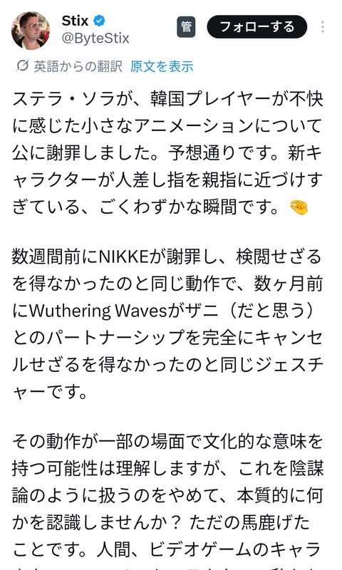 1:以下、?ちゃんねるからVIPがお送りします:2025/11/19(水) 22:42:38.762 ID:T65TRh3XM.net 美少女キャラクターの人差し指と親指が近付いてるのに韓国人がキレて炎上して公式が謝罪したみたいなんだけど 2:以下、?ちゃんねるからVIPがお送りします:2025/11/19(水) 22:43:39.123 ID:jqN2zsSQ0.net チンコちっさってこと? 2ch2chblognews2ch