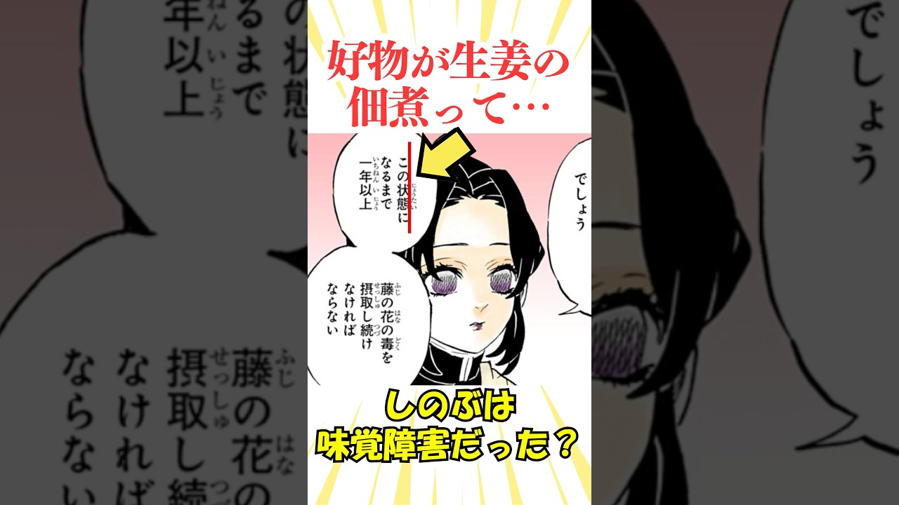 鉱物が生姜のにってまさか実はしのぶは 味覚障害にもなっていた。藤の花の毒を1 年以上かけて摂取していたしの。濃くなっ た化粧は毒による体調不良を周りに悟らせ ないためと言われているが実は毒の影響で 味覚障害にもなっていた可能性がある。 まず藤の花の毒だが花には吐き気と蹴りを 引き起こす毒が死には呼吸困難麻痺の毒が ある。こんな毒を1年以上摂取し続けて 健康でいられるはずがない。絶対に身体の あちこちに不具合が起きていたはず。 そしてしのぶの鉱物である生姜のつ煮だが 調理の際は醤油と砂糖で甘辛く煮込むので 味付けはかなり濃い。そこに生姜のピリッ とした絡みも加わるので死体への刺激も 強い。しのぶは毒の影響で味覚障害になっ たため味の濃いものを好むようになったと 指摘されている。ちなみに生姜の絡み成分 には体を温める血構を促進する消化を 助けるなどの効果がありと下痢などで弱っ た消化期間の負担を少しでも減らそう男と 好んで食べていた可能性もある。体張り すぎだよ。しのぐ姉さん。