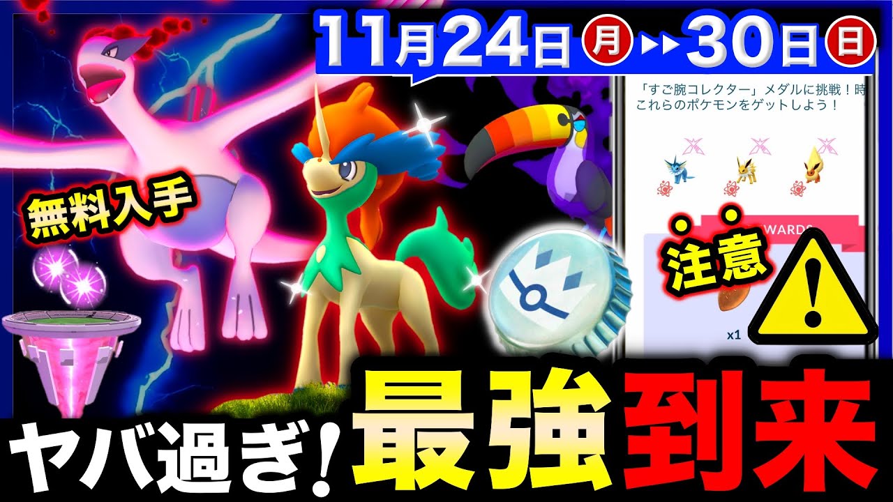 皆さん、こんにちは。たしです。11月 24日から30日までの大事なポイントや 注意点などを解説します。まず毎週月曜日 の午前9時以降に歩いた距離に応じて報酬 が変わる中間リワードを受け取ることが でき、星の砂や専用の卵などがもらえます 。 続いて今週のMAックスマンデーでは ダイマックスEVが対象になります。 マックスバトルウィークエンドはこの日の 21時までとなりますが、ダイマックス EVは日曜日まで普通に出現するので焦ら ず狙っていけます。登場中の2つの コレクションチャレンジの期限も迎えるの で、この日の夜までに完了させて報酬を 受け取るのも忘れずに。パワフル コレクションチャレンジの方はランダム 進化の3系進化させる必要があり、難易度 が高く運が悪いとダイマックスEVを 230匹くらい進化で消費してしまいます 。ギリギリまで粘ってどうしても3匹の 進化が揃わない場合名前進化を活用した ことがない人はここで使用するのもありだ と思います。PVの名前を水希にして進化 させるとシャワーズラ像でサンダース淳で ブースへ1回のみ確定で狙ったポケモンに 進化させられます。ダイマックスの色違い や高体が取れても進化はまださせず特別技 を習得させられる12月のコミュニティ デーで進化させましょう。もし高個体えが 取れたらブラッキーはハイパーリーグ用、 ニンフィアはジム防衛やマスター用。 グレーシアもマックスバトルでは現状最強 の氷アタッカーになるので自身の使用し たいバトルに合わせて進化先を今のうちに 決めておくといいと思います。ただ攻撃 種族値が238を上回る氷タイプの ダイマックスが実装されたらグレイシアは 火力2位になり、季節的に来シーズンは氷 タイプの新しいダイマックスが新登場する ことも十分考えられるので、グレーシアは すぐに火力が更新される可能性がある点を 把握しておきましょう。もうすぐ12月の 対象ポケモンの発表があると思うので、 更新が確定したらインフィア用にするなど で対応するといいです。 続いて火曜日の午前10時より伝説 メガレイドが切り替わり、コバルオン、 テラキオン、ビリジオンとメガプテラ、 メガチャーレム、メガガブリアスが登場し ます。伝説レイドの3匹は特別技の聖なる 剣を覚えてこそ大活躍できるので、すごい 技マシンスペシャルを使用しない前提なら スルーするか。今後特別技を覚えて登場し た時のためにア集めをしておくのはありで 、主にテラキオンはジムレイドの アタッカー、コバルオンビリジオンは5 バトルリーグで活躍します。メガ進化の3 匹も全て複合タイプで、捕時に2つの タイプにアボーナスをかけられるため、 なるべくメガレベルを上げておくといい です。 同じ火曜日の午前10時から6日間決戦の 時イベントが開催されます。イベントが 始まるとスペシャルリサーチ変わりゆく 物語を最終ページまで進められるように なると同時にケルディオの覚悟の姿への フォルムチェンジが可能になり姿変更時に 特別技の神秘の剣を習得します。 スペシャルリサーチ変わりゆく物語は12 月2日午前9時59分まで受け取ることが でき、受け取り逃した場合は戦立ポケモン を解明セの完僚後に挑める新たな スペシャルリサーチでケルディオと出会う ことができます。そして初登場となる 色違いケルディオを入手できる続 終了時間までショップにて販売され、 ウェブストアでは続のチケットに プレミアムバトルパス1枚と星のかけら1 個が付いてくるので少しお得に購入でき ます。過去のケルディオや今回新たに入手 した色違いケルディオは個体値がいまいで も強化するのがおすめでケルディオは覚悟 の姿へフォルムチェンジしても攻撃防御 HPのステータスに変化はありませんが 新技の神秘の剣を覚えることで最強の ルカリオを抜いて格闘アタッカーで ナンバーワンになります。ケルディオの 攻撃個体値が仮に1番低い10だったとし てもダメージ効率は58.29となり攻撃 個体値が最大の15のルカリオよりも高い です。神秘の剣の性能はどのバトルでも 非常に高く格闘タイプの強い技でジム レイドの波動弾トレーナーバトルの聖なる 剣がありますが神秘の剣はこれらの完全 上位互感の性能となります。さらに ケルディオは耐久力も他の格闘アタッカー に比べて高いので講手共もに安定しやすく 今後も長く活躍してくれます。これらの 理由からケルリオに不思議なアエクセルを 投入して最大強化する価値が十分にあるの で育成を検討してみてください。 このイベントでは全て格闘タイプの ポケモンが対象になっていて、野生出現の 沢村、エビラー、カポエラーの3匹は 色違い確率がアップします。これらは ヴァルキーから進化させる場合、1番高い 個体値がどれかによって進化先が変わるの で、進化で色違い図鑑を埋めるとなると 難易度が高くなります。3匹の色違いを 全て揃えられるチャンスなので持ってい ない色違いは最優先で狙っていきましょう 。翡水ラと魔剣化にもレア出現し、この2 