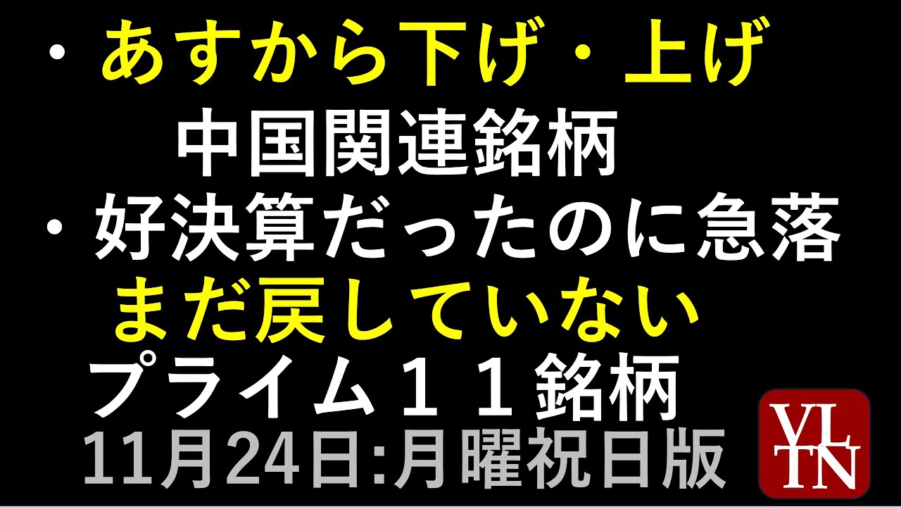 今週下げそうな銘柄・上げそうな銘柄。好決算なのに急落し、まだ戻せていないプライム市場11銘柄。11月24日(月・祝)~あす上がる株。最新の日本株情報~
