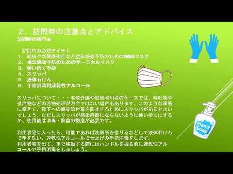 今から、え、感染症の予防や蔓延防止の ための研修を行います。よろしくお願いし ます。第2回感染予防研修及び感染予防 編集。 今回の研修は法定研修となっております。 各事業所長を中心とし、感染対策委員会を 設置しております。 半年に1回の委員会の開催BCPの内容の 見直しを行います。 スタッフのための年1回の研修を行います 。 訓練や演習を年1回開催を行います。 研修後は直ちに研修報告書を作成し提出し てください。 目次1訪問看護に備えて準備することの 復習を行います。2訪問時の注意点と アドバイス再確認を行います。 編集差し 事故初動対応の確認訪問看護における感染 暴露太陽マニュアルの確認差し 事故防止のための理解を深めイメージ トレーニングを行いましょう。 1訪問に備えて準備すること訪問に備えて 準備することの再確認を行いましょう。 感染を持たない、持ち込まない。この2点 が在宅医療において異感染者である患者 さんに対する感染予防の基本です。 在宅量に充実する医療従事者は自身の感染 症に関する器用歴の確認と予防摂取が必須 です。 空気感染を起こす水筒とマシン、その他風 お腹風の起用歴がない場合は予防摂取を 受けておきましょう。 インフルエンザの予防摂取は復欠です。年 に1回会社の福利構成として全額補助にて インフルエンザ予防摂取を受けていただい ています。患者さんに対しても訪問する 看護師と同じく水筒、マシ、風、オ福風 など予防摂取のウムを確認し、未摂取の ものがあれば摂取を進めます。また肺炎金 とインフルエンザは特に摂取を進め ましょう。 現在肺炎給金インフルエンザともに65歳 以上の高齢者は定期摂取となっております 。 に訪問時の注意点とアドバイス訪問時の 傾向品訪問時の必須アイテム1や進行感染 症など空気感染予防のためのN95マスク 2秘感染予防のためのサージカルマスク3 使い捨て手袋4スリッパ5 拳6趣旨消毒用即管性アルコール スリッパについてロー老介護やトリオ車の ケースではオト物や排泄物などお仏処理が 満でない場合もあります。このような事態 に備えて靴下への感染原付を防止するため にスリッパがあると良いでしょう。ただし スリッパが感染経量にならないように 使い捨てにするか使用後は消毒除菌の徹底 が必要です。 利用者卓に入ったら可能であれば洗面所を 借りるなどとして液体石鹸で手を洗い即管 性アルコールで仕上げの趣旨消毒をします 。利用者卓を出て車で移動する際には ハンドルを握る前に即管性アルコールで 趣旨消毒をしましょう。 編集1訪問看護における感染暴露対応 マニュアル。 今回張り差し事故について進めていきたい と思います。あり差し事故が発生したら1 初動対応まず戦場消毒 2報告感染対策責任者所長マネージャーへ の高等報告 暴露状況を完潔に記録記録用紙あります3 医療的評価早めに医療機関受信血液検査 暴露減検査4連絡体制事業所line 保険所や老窓口ジムに連絡 5フォローアップ 予防ワクチン検査スケジュール心理的 サポート 初動対応の確認をしましょう 事故が起きた時の初期対応1流水と接近で 洗浄装負を強くこすら 優しく洗い流す。眼球や粘膜に暴露した 場合は大量の流水かこ15分ほどで洗浄。 その際消毒薬は使わない。2消毒ポピドン 用や消毒用エタノールで装部を消毒する。 洗浄を優先し消毒のために対応を送らせ ないようにすること。 3血液を強く絞り出さない組織を傷つける 可能性があるため絞り出す行為は避け ましょう。 暴露事故記録シート。 こちらの記録に残して後の対応が適切に 行えるようにしましょう。全体ラインの フォルダーにデータを入れておきますので お使いください。 感染リスクの評価と検査対応。暴露源の 感染状況を確認します。患者が感染症要請 かどうかを確認。不明な場合は感染して いると仮定して対応します。必要な検査を 受賞者に実施します。HIV、HBV、 HCVなどの交代検査必要に応じての対応 。HIVはAHIV薬PEPを2時間以内 に内服開始。HBVはHBI 免疫グローブリン投与ワクチン平洋が最も 広格的とされ、感染予防率は90%以上 です。HCV感染が確認された場合はO ウイルス薬DAAによる治療が可能です。 地率は90%以上です。上の表には ウイルスに対する感染率と主な症状を、え 、表しています。HBV、え、感染 張り差し事故時の感染率は約6から30% 。主な症状は発熱、検帯感、横断などです 。HCV約1.8%初期症状は少ないが性 化で監視疾感を起こします。HIV 0.3% インフルエンザ王症状免疫不全を起こし ます。このようなことにならないように、 え、初期対応、え、すぐ検査して、え、 対応していくことが重要だと言えます。 張り差し事故防止のための危険余地 トレーニングを行います。 え、まず1各事業所もしくは小グループで どこが危険かどう防ぐかを話し合いを行っ てください。ロールプレイ形式のKYT 実際の訪問看護場面を再現し危険余地力を 高めていきます。2物品があればイメージ トレーニングを行いながら考えて