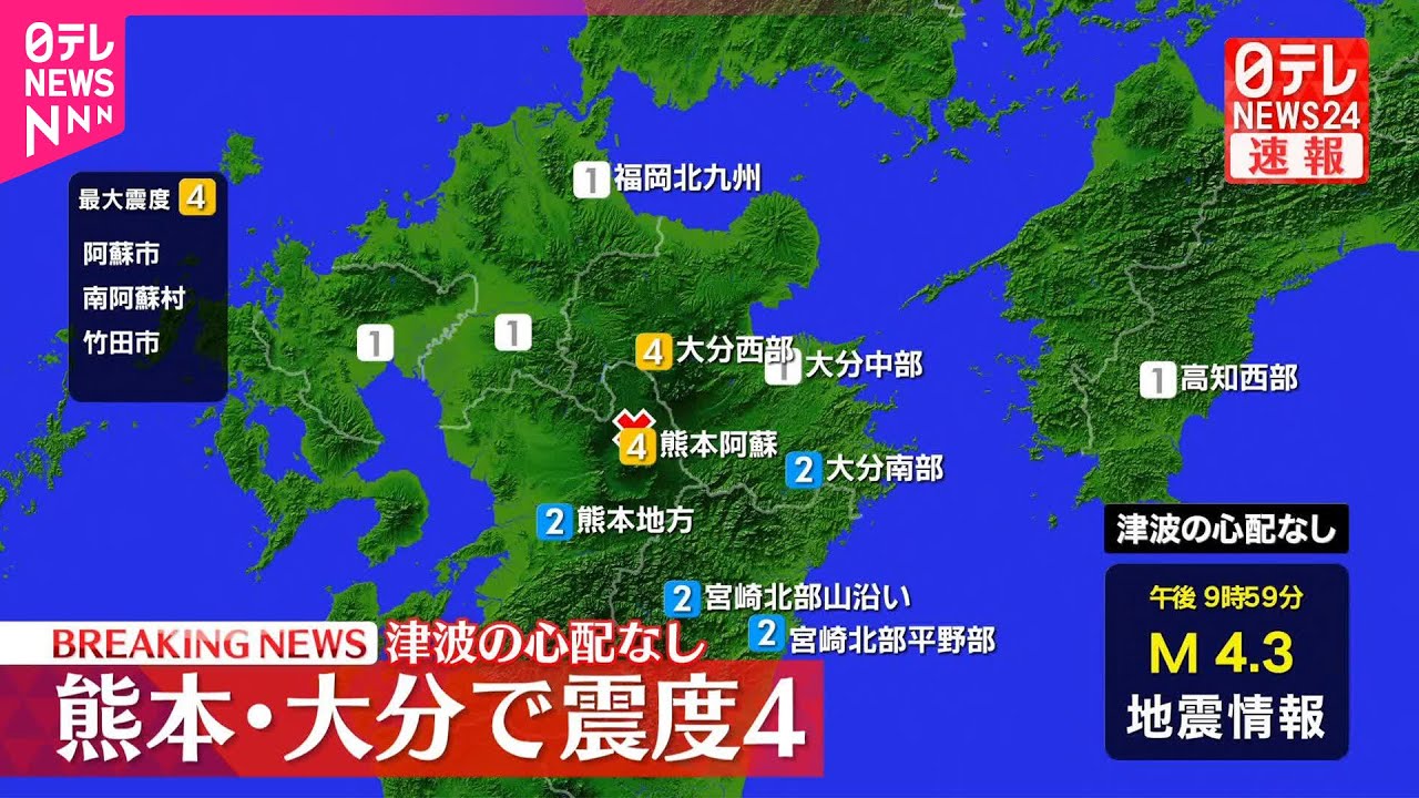 気象庁によりますと、午後9時59分頃 地震がありました。この地震による津波の 心配はありません。震度4を観測したのは 熊本県麻市、南村、大分県竹田市。震路3 を観測したのは宇山、熊本、高森町となっ ています。新玄地は熊本県麻地方。神玄の 深さは10km、地震の規模を示す マグニチュードは4.3と推定されます。 津波の心配はありませんが、この後も同じ ような規模の地震が起きる恐れもあります 。今のうちに落ちてきそうなもの、倒れて きそうなものがないか注意をするようにし てください。 またお休み前の不安な夜を過ごしているか と思います。え、停電などにも備えて枕元 に懐中電灯など明りを準備するようにして ください。この後も大きな揺れが来る恐れ もあります。いつでも避難できるよう、え 、靴や眼鏡、最低限の上備薬など必要最低 限のものを枕元に準備してお休みになって ください。 え、どうか周りに倒れてきそうなものが ないか今一度確認し、え、少しでも体を 休めるようにして