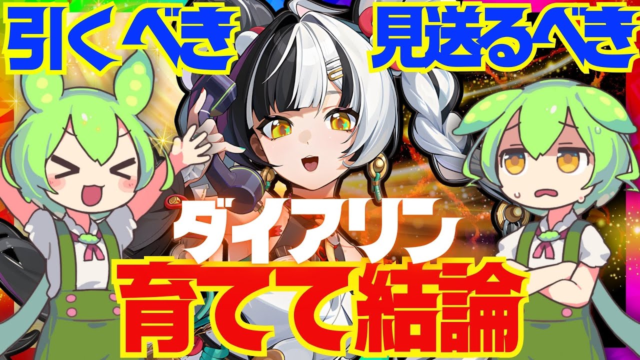 [音楽] こにゃにゃちは。今日のテーマはドドン。 ついに実装されたダイヤンなのだ。 ダイアリンは全初の味方の集結スキルを 強制発動できる激や撃破。ガイアリンでお 手軽ブレイクして集結スキル2連続で環境 破壊みたいなこともできて環境が大きく 変わる第一歩って感じなのだ。そして スンダモンチェク。今回の チェックポイントは集結誘発だけじゃない ダイアリンの火力サポ能力強化特殊スキル を駆使することでブレイク時に弱体倍率 30%とブレイク継続時間2両延長の効果 がつくさらに編成シナジー効果で全体ダメ バフ40%大山4セットを装備させれば さらに回心ダメプラ30%のバフも かけれるということもあってサポ性能も 非常に高い撃破になっているのが魅力なの だ。そんなダイアリンが実装され全の戦闘 環境はどのように変用していくのか。 そしてダイヤリンは強いのか瞬コとの相性 はどうなりそうなのかぶっちゃけ引くべき なのか水晶ビルド育成凸これらを 含めダイアリンの完全解説をしていこうと 思うのだわけで早速始めていくのだほナ はいといわけでまずガダイアリンを使って みての感想というか思ったことなんだけど さすがにこれは新環境の幕かと思ったね えそれほど強いてかしら そうだ ねみれば使みるほど強さを実感するエージェントなの 今までの撃破のいいとごとりをしつつ集結 誘発まであるからね。ミやびこ今まで露骨 インフレを避けてきた全ゼロもついに一歩 踏み出すかなと思いのだ。瞬コと金合いと いうか相性も気になるわね。そこに関動画 の後半引くべきかでがっつり話からまずは 性能概から聞いてのだということで ダイアリンってどういうエージェント なのところから説明していくよ。 ダイアリンは物理属性の撃破。役割は 激破しサブアタッカーか火力ポーターって ところかしら。そうだね。に関しては 表撃破、裏撃破、または支援っぽい感じの 撃破とバリエーションは多数あるけど、 その中でもダイアリンは表撃破のイメージ かな。機械エージェントで言えばちいかも 。ただちいほどですっりってわけではなく 、ちゃんと表に出る時は出て役割を果たし 、綿裏に帰って行くって感じかな。ほん ならそんなダイアリンの強みについて説明 していくよ。ダイヤリンの最大の強みは何 と言っても全市場発である集結スキルの発 にある一定の条件を達成することで発動 できる強化特殊によって次に出るキャラの 攻撃を集結スキルに変えることができるの だ。これによってアタッカーの効果力攻撃 がいきなり叩き込めるのはもちろん集結で の追加効果も序盤から発動することが できるのがメリットだね。集結が強い エージェントなんかはかなり輝きそうね。 そしてダイアリンの強みはこれで終わら ない。彼女はちゃんと撃破としての役割も 果たす。強化特殊のコンボで効率的に ブレイクゲージを蓄積させることができ、 敵をブレイクした時は効果によって ブレイク継続時間が2両延長され、 ブレイク弱体倍率がプラ30%される。 ブレイク性能が高く、ブレイク後の恩恵も 大きくなるということで久しぶりに王道の 撃破って感じのエージェントだなと思った のだ。そして火力効果はまだある。編成 シナジーの効果でダイアリンは全体バフを 発動することができる。 その効果は全体ダメバフラ 40% さっきの弱体倍率アックとブレイク時間延長に加えてこれだからサポート能力的にもかなり高い水準にあると言えるね。 集結誘発ができブレイク性能も高く火力歩効果も一流。交換えると現時点でも非常に強そうなエージェントに見えるわね。 手な感じがダイアリンの大まかな強みになってくるのだ。ほんなら具体的な性能解説に移っていくよ。 ダイアリンの性能を理解するには コアパッシブを見ていくのが1番早いと いうことでコアパの文章を覗いてみると こんな感じなのだ。まあどう考えても読む 気能せる長文になっているね。大丈夫。 みんなの代わりに僕が読んでおいたから ちゃんと噛み砕いて説明するから安心して ね。ほんならその説明をしていくよ。 フィールド入場時ダイアリンは高評価と いうゲージを60ポイント獲得することが できるのだ。HPバー下のゲージのことだ ね。そして戦闘開始時から言えることは もう1つある。ダイヤリンは自身の開幕 回心率が50%を超えている場合、超えた 回心率1%に月自身の衝撃力をプラスに することができる。これは最大100まで 上げることができる。詰まるところ ダイアリンの回心率を100%まで上げる ことができれば同時に衝撃力もプラス 100することができるわけだね。1粒で 2度から回心率を上げておきたいわね。 むほら話を小細かに戻 してダイアリンがまずやることは エネルギーを75まで貯めることなのだ。 その間は表にはデズニーアタッカーの攻撃 でお茶を濁すことをお勧めするのだ。やる ことないしね。ほんで75までエネルギー が溜まったら表に出て強化特殊スキルを 発動するのだ。ダイヤりンが発動できる 強化特殊は