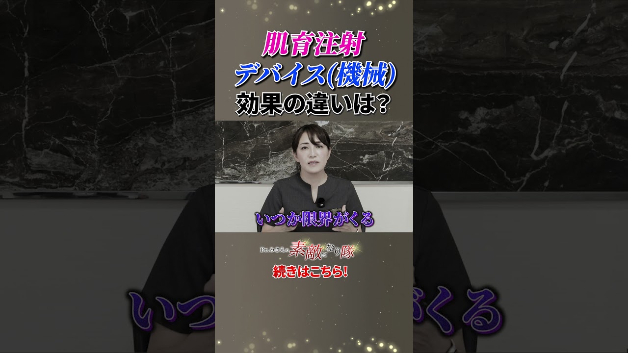 機械っていうのはですね、すごい速性も あって、ダウン体タイムもなくて、ま、私 もすごい好きなんですけれども、皮膚の中 に熱を入れて、ま、神秘ソだとか非カ組織 あたりをこうギュっと引き締める、え、 配布であればスマスっていうとこ引き締め るっていう治療じゃないですか。 引き締めることで1度に多くのコラゲを 作り出すことで若らせるのがデバイスなん ですけれども、年齢と共にコラーゲン量 減ってくるのに一生懸命熱を入れて 増やそう増やそうとしてもそれはいつか 限界が来ますよね。絶対に自分皮膚の コラー原料エラスチン量というものの土台 を重ま増しするっていう施術ではない。 それが肌注射になるとご自身の肌の基礎力 ですね、自体を上げることができる。これ が今までのデバイスと肌肉所の大きな違い になり