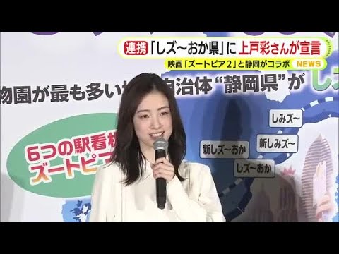 午後2時 県庁を訪れたのは俳優の上彩さん。上戸さんはディズニー映画ズトピア 2 で主人公、うさぎの警官、ジュディの声優を担当しています。冒頭を発表されたのが [音楽] 発表したいと思います。 はい、 どうぞ。 せーの せーの。はい。 今回ですね。 はい。え、このお間ですね、 静岡県をですね、静岡県 [音楽] を開名をいたします。岡県 静岡県とズートピアがパートナー都市に静岡県として映画と連携し、県内外に静岡の魅力を PRします。 様々な動物が登場するこの映画。 県内は動物園ズの数が全国の自治体で最も多く、 [音楽] 懸命に唯一図が入ることからパートナー都市に選ばれました。 連携企画では県内 6つのJR や鉄の駅も新浜駅、清水駅、川駅などに解明。駅名看板もピア仕用になります。 [音楽] 是非今回はあの静岡の皆さんにもズートピアを見ていただきたいと思いますし、ズトピア 1 の方もこれを気に静岡にたくさんを運んで欲しいなと思っております。 パートナー都市の期間は映画の公開が終了するまでで観光を利用したスタンプラリーなども行われるということです。お願いします。 Ja.