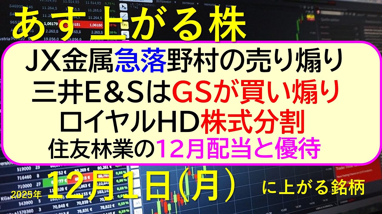あす上がる株 2025年12月1日(月)に上がる銘柄。JX金属急落、野村の売り煽り。三井E&SはGS買い煽り。ロイヤルHD株式分割。住友林業12月配当~最新の日本株情報。高配当株の株価やデイトレ情報~