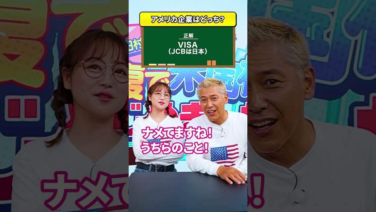 レベル1配信サービスのNetflixと ユクTトちらがアメリカ企業でしょう。 レベル1ですね。これは せのNetflix 大正解です。 うん。 ではレベル2。 クレジットカードブランドのビザと JCBどちらがアメリカ企業でしょう? うん。 せ せのビザ 大正解です。 ちょっとちょっとちょっと舐められてますよ。舐めてます。 レベル1がレベル1が続いてますよ。 めっちゃ簡単。 はい。ではレベル3。 自動車メーカーのフードとアウディ。どちらがアメリカ企業でしょう? せーの。フォード。 フォードね。フォードじゃない。 フード。フォード。 フード。 大正解です。 はい。ありがとうございます。 あのアディはね、 どっちだっけ?ヨーロッパのどこだっけ?ドイツ。 ドイツ。 そうですよね。アディ好き。 はい。