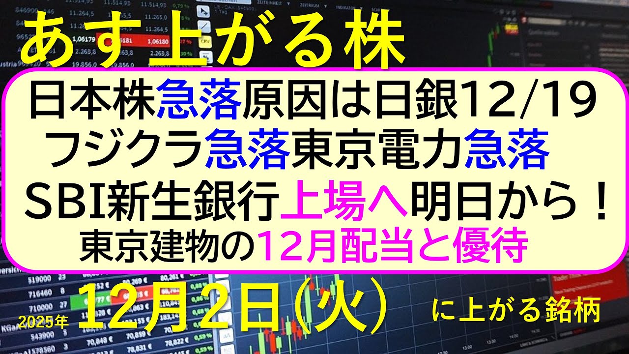 あす上がる株 2025年12月2日(火)に上がる銘柄。日本株急落原因は日銀。フジクラ急落、東京電力急落。SBI新生銀行上場へ。東京建物の12月配当。~最新の日本株情報。高配当株の株価やデイトレ情報~