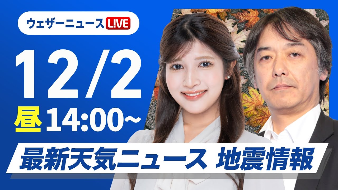【ライブ】最新天気ニュース・地震情報 2025年12月2日(火)/週中頃は今季一番の寒気が南下 西日本でも雪の可能性〈ウェザーニュースLiVEアフタヌーン・岡本結子リサ/宇野沢達也〉