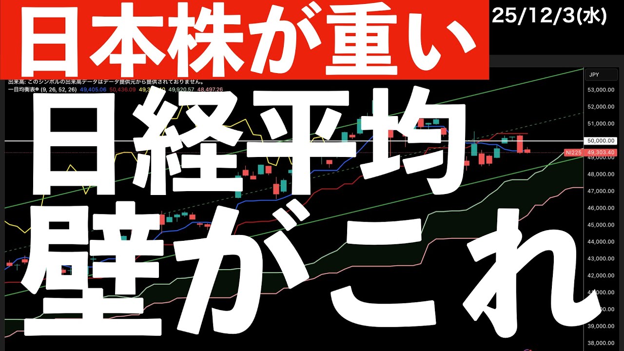 おはようございます。森口でございます。 今日もよろしくお願いします。今日は12 月の3日水曜日で戴こ日本株が重い日経 平均壁がこれということで話をしていき たいと思います。やっぱ、ま、テクニカル 的な1番メジャーなやつではあるんです けども、ここで止められてるかなという 印象を持ちました。もちろん今日の米株の 情報、昨日の日本株の情報を踏まえて話が できればと思っていますので、今日も最後 まで是非お付き合いください。ということ で、このチャンネルでは最新の状況を 取り上げた上でのテクニカル分析を必ず 毎朝7時目標で更新をしております。 なるべく踏みで聞いても分かるような形で なるべく分かりやすい言葉使って解説を 続けていきます。毎朝自更新の毎日 チャート分析チャンネルチャンネル登録を よろしくお願いします。それでは早速昨日 の振り返りから入っていきましょう。まず 昨日の日本株なんですけども、その前の日 に950円下げていたんですが、昨日はね 0.17円のプラスでした。で、しかも 直前にマイナス転換してギリギリプラス まで戻ってきたという形なんですけども、 ちょっと重たいかなという印象の方が強い ですかね。で、一日経先物もまだそんなに 上げてないので5万円っていう節面は超え づらいなという風に思いました。で、 グロースがまた大きく下げているんですね 。これ非常に心配でございます。日経平均 の上昇で頑張ったのがファナック。下落与 に引っ張られてしまったのがソフトバンク グループ。この2銘柄はちょっと色々 取り上げてみたいなという風に思ってい ますし、あとは日銀の上田総裁の発言後に 利上げに対する警戒で、え、昨日昨日か 下げましたけども、銀行の強さを見ると なんかそういう感覚はまだ続いてるのかな という風に思っています。アメリカ株 チェックしていきましょう。4時6分時点 ですが1%未満の上昇っていう感じ でしょうか。反動体が少し強めに反発でき てますね。ヨーロッパ株見ていきましょう 。こちらは高安まちの展開でございます。 業種別ヒートマップチェックしていくと 大体ま、半分ぐらいでしょうか。で、 どちらかとハイテック中心のNASAの方 がしっかりと上がっている印象はあります ね。で、反動体株だとアプライド マテリアルズとかあとはテキサ インストルメントとかINTとかね、こう いったところはしっかりとした動きになっ ております。主力どころはまちまちな感じ でしょうか。日経金先物が200円から 150円ぐらいの上昇という形になってい ます。為せが155円の96000。多少 円安に戻ってきた印象はあります。ビッス が16.68。これが落ち着いてるんでね 、米株はそんなに心配なさそうな気はして います。長期金利が4.088 。え、原油が若干の下落。金はさすがに ちょっと上がりすぎたんでしょうかね。え 、下落をしているという形です。なお今日 は暗号資産が非常に強く反発できてますね 。これは非常に安心感をもたらしたと思い ます。 それでは見ていきましょう。日経平均大幅 安5でも反発できず日経平均の壁はここに あるということで話をしていきたいと思い ます。まずはいつも通りですがアメリカ株 が始まった後の日経新聞から確認をして いきましょう。反発できた理由は ビットコインの上昇ハイテック株に買と いう内容でした。え、先ほど見ていただい た通りビットコインの上昇率が非常に高い ですね。で、え、そんなにこうポジティブ な材料があるというわけではないんです けども、ま、それにより投資家のリスク 先行思考が、え、改善しているという形で ございます。そして利下げ観測も引き続き 相場を支えているということですね。これ はもう前から伝わってきた内容ですけども 、トランプ大統領時期FRB議長に ハセット委長を選ぶ可能性が高いという ことですね。ま、リサゲが続くんじゃない かという見方が続いていますので、ま、 そういったところからリスク先行の配テ株 っていう形が起こりやすかったんだと思い ます。経済仕用を確認していきましょう。 今夜昨番アメリカで発表された経済指標は 特にはなさそうです。ニパウルFRB議長 の発言がみたいなニュースも特には 見つかっておりません。ザラバの中では 上下していますが、そんなに大きく動い てるという印象はありませんでした。売買 だけランキングを見ていっても めちゃくちゃ変動率の大きい大型株って いうのがあるわけではなかったですね。 そこで、ま、いつか気になるニュースを見 ていきたいと思います。まずドル安圧力 強まる。完税巡る判断。FRB人事日 利上げの30区ということですね。この 季節が弱含みやすいドルという形で抑え といていただくといいと思うんですけども 、それプラス完税FRB日銀という30に よってドルが下がっちゃう可能性がある よってことを是非抑えといてください。で 、ドルが下がるということは相対的に見た 円は高く評価されますので円高に行くかも しれないということで